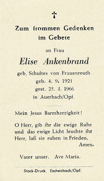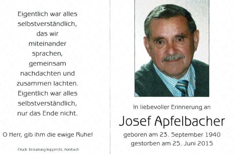 Anders Hubert 03.05.1902-05.08.1986 Ankenbrand Elise geb Schultes 04.09.1921 - 25.03.1966 Apfelbacher Josef 23.09.1940 - 25.06.2015 Apfelbacher Margarete geb Hollfelder 17.04.1898 - 14.11.1979