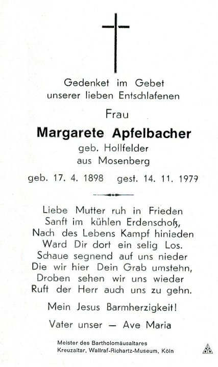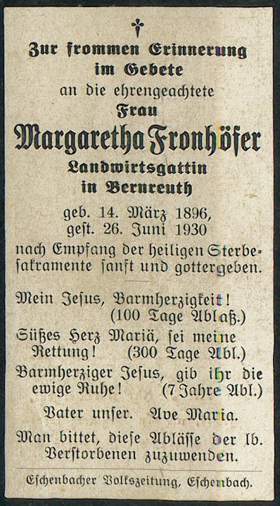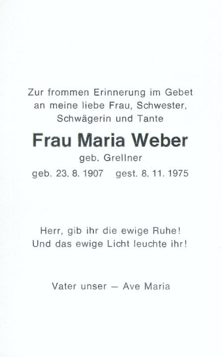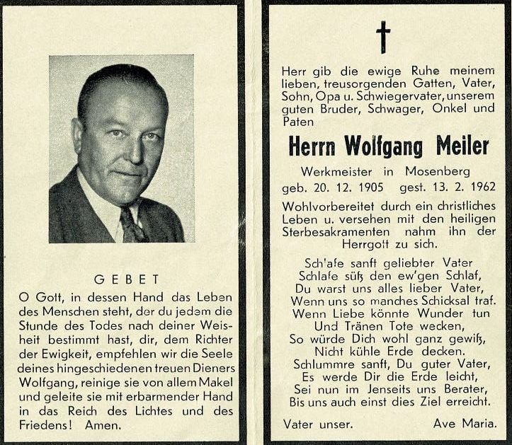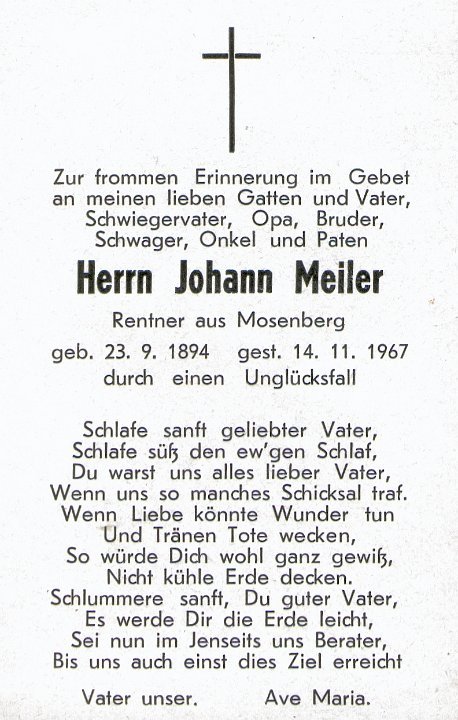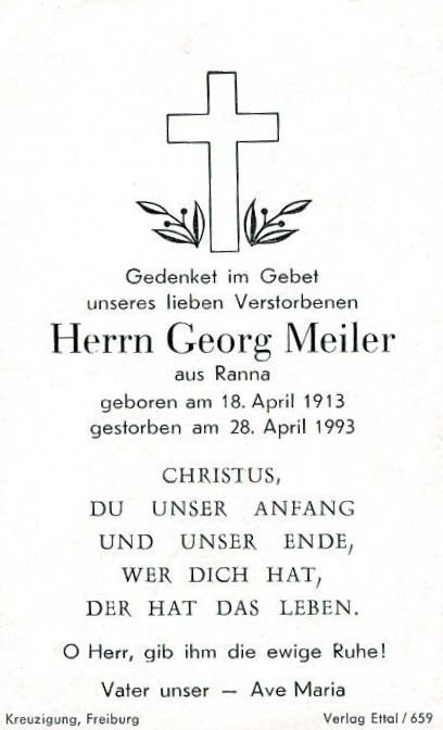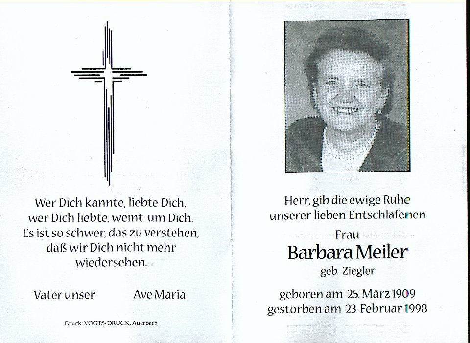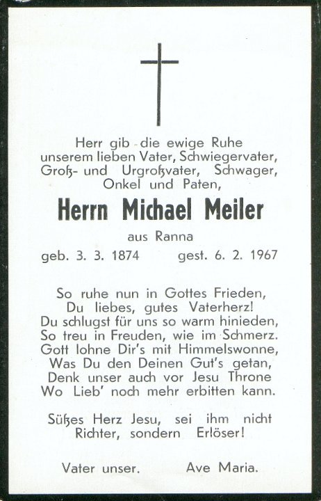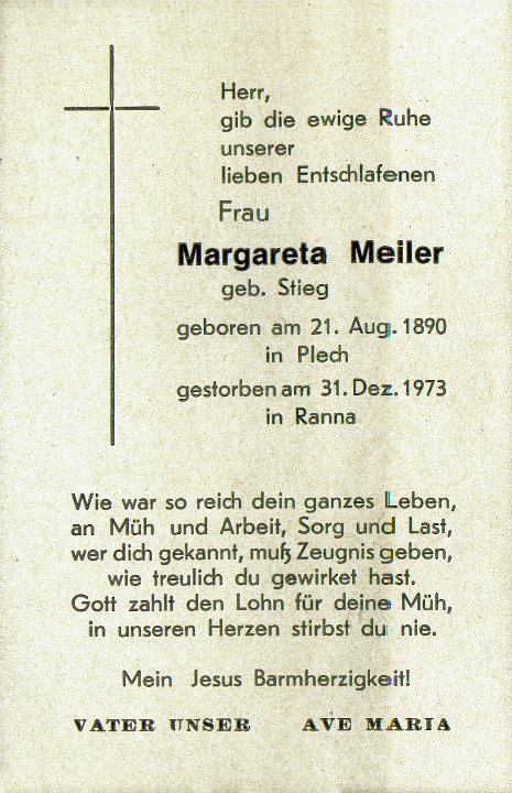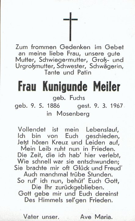 Meiler Kunigunde geb Fuchs 09.05.1886-09.03.1967 Meiler Margareta geb Stieg 21.08.1890-31.12.1973 Meiler Michael 03.03.1874-06.02.1967 Meiler Sybille geb Kohl 03.08.1919-14.07.2002