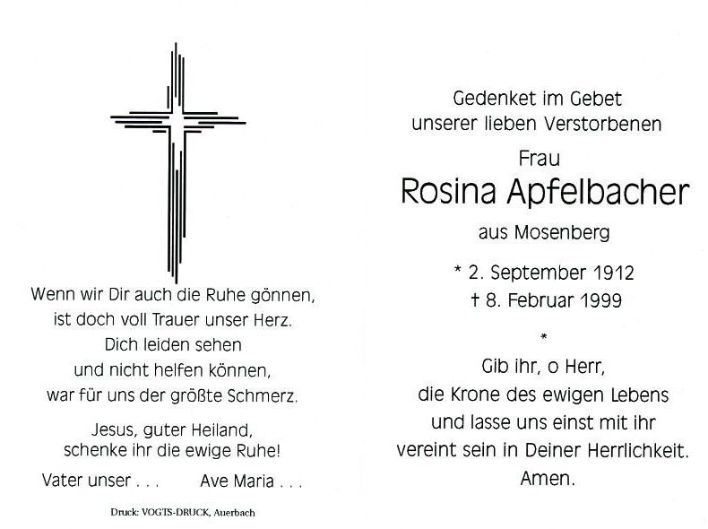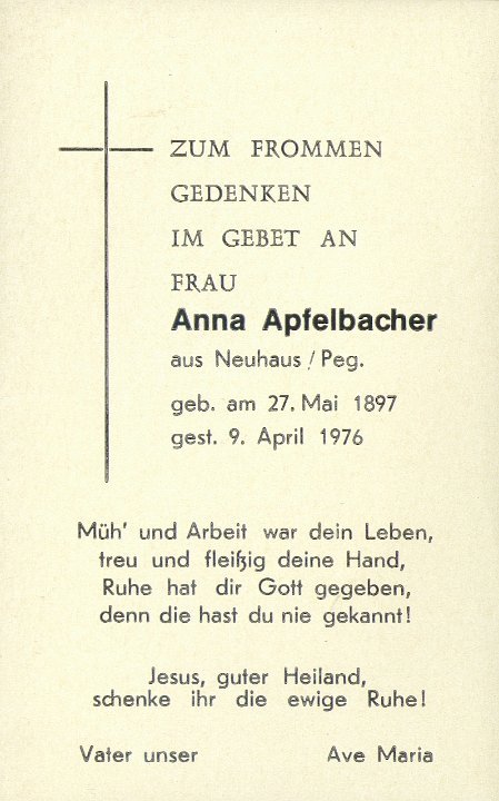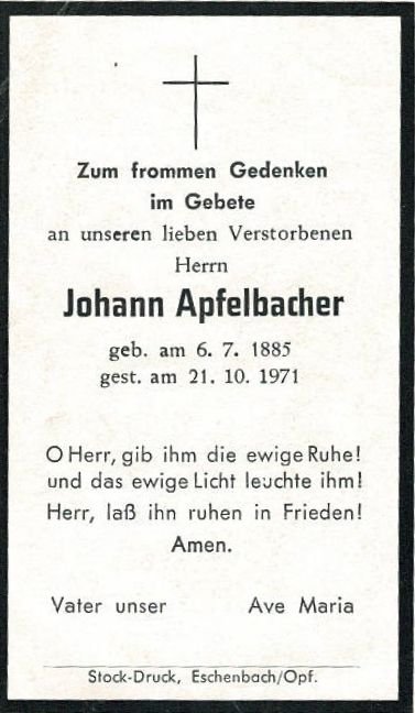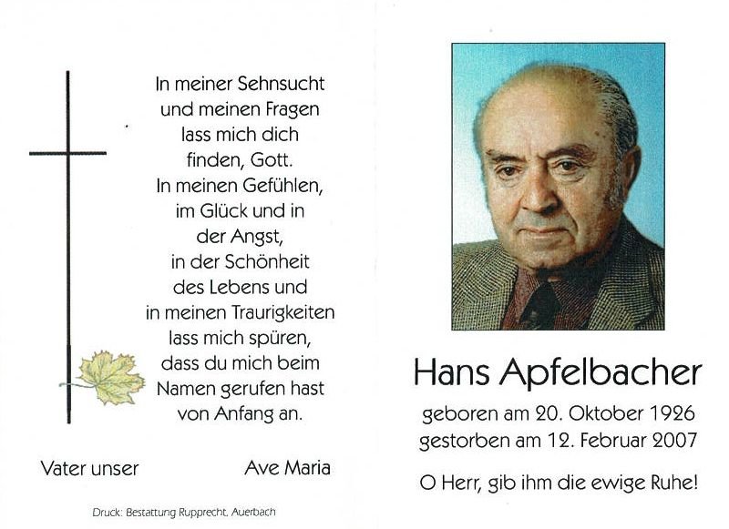 Apfelbacher Anna 27.05.1897-09.04.1976 Apfelbacher Hans 20.10.1926 - 12.02.2007 SB Apfelbacher Johann 06.07.1885 - 21.10.1971 SB Apfelbacher Rosina - 02.09.1912 - 08.02.1999 SB
