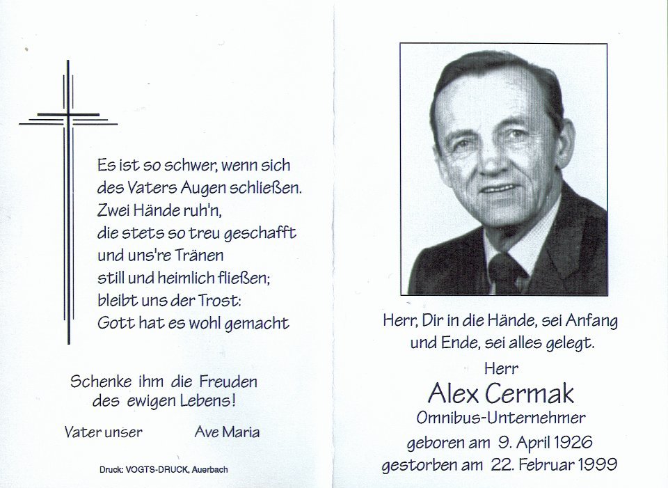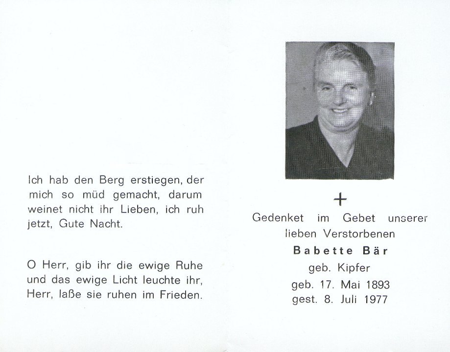Buchmann Werner 20.04.1948 - 12.04.2019 Bär Thomas 13.01.1932 - 09.08.2016 Bär Babette geb Kipfer 17.05.1893-08.07.1977 Cermak Alex 09.04.1926-22.02.1999