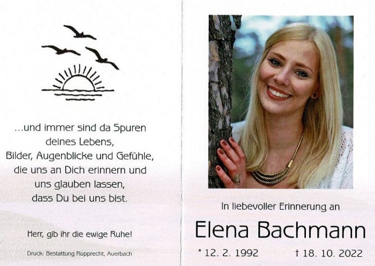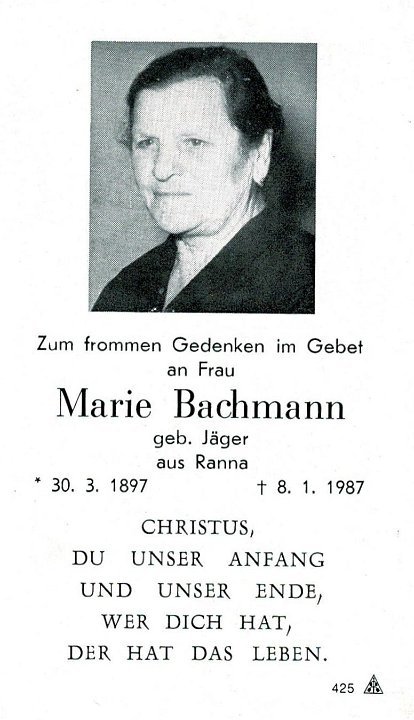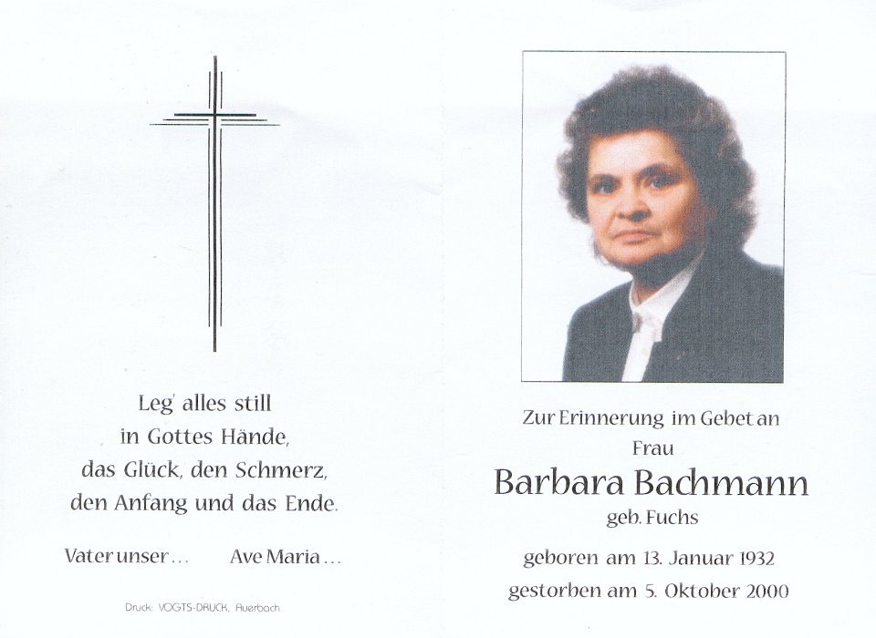 Bachmann Anni geb Kipfer 24.03.1931 - 19.06.2006 Bachmann Marie geb Jäger 30.03.1897 - 08.01.1987 Bachmann Barbara geb Fuchs 13.01.1932-05.10.2000 Bachmann Elena 12.02.1992-18.10.2022