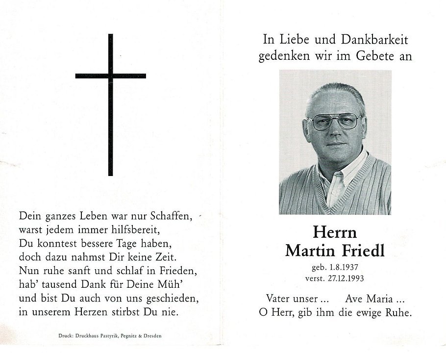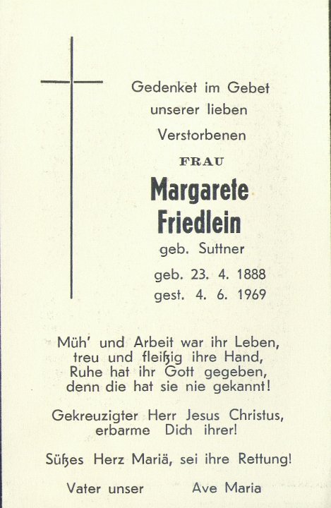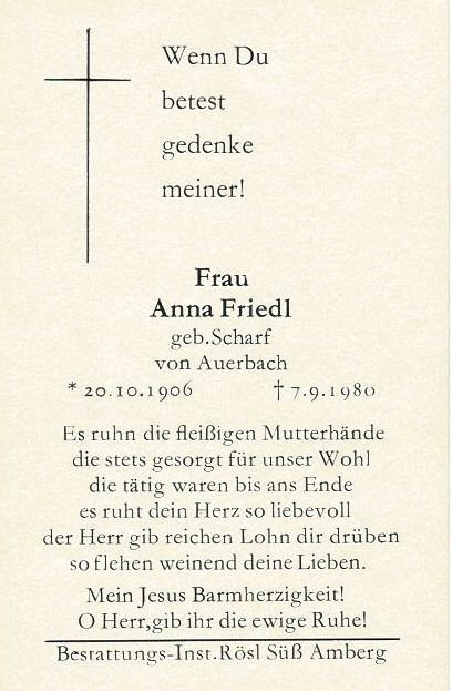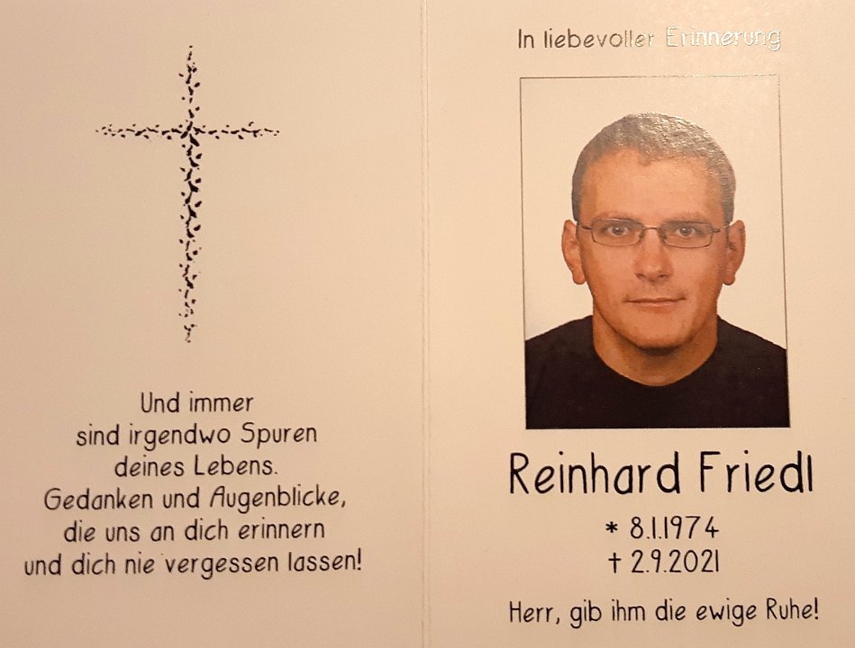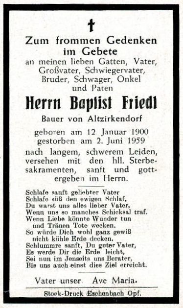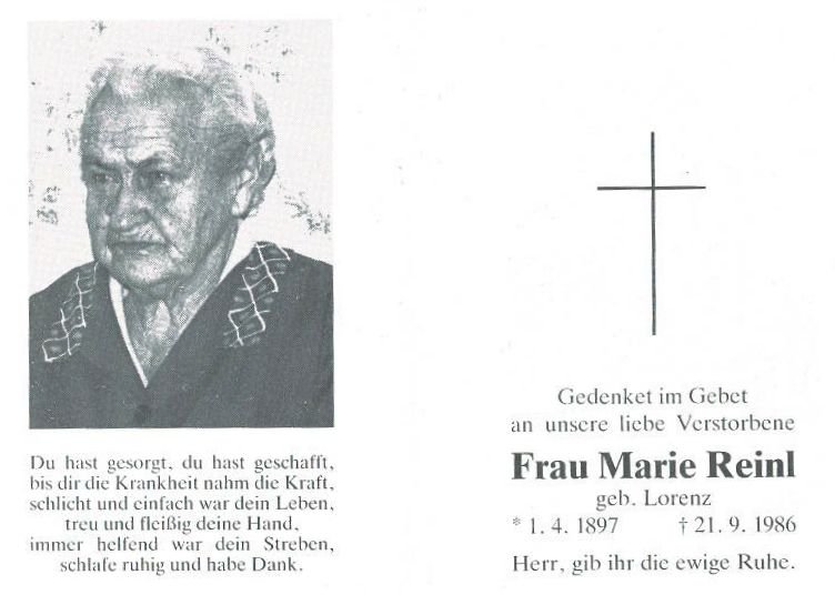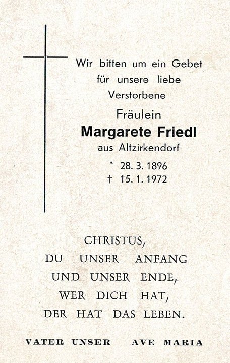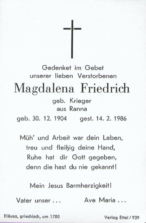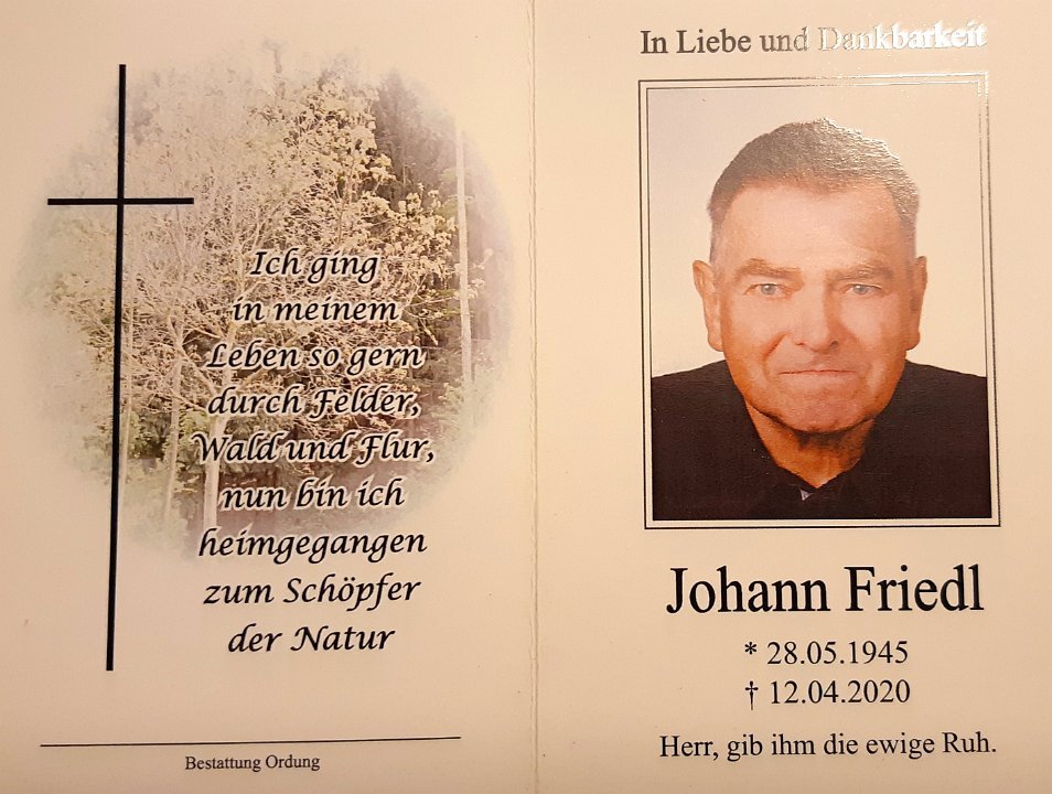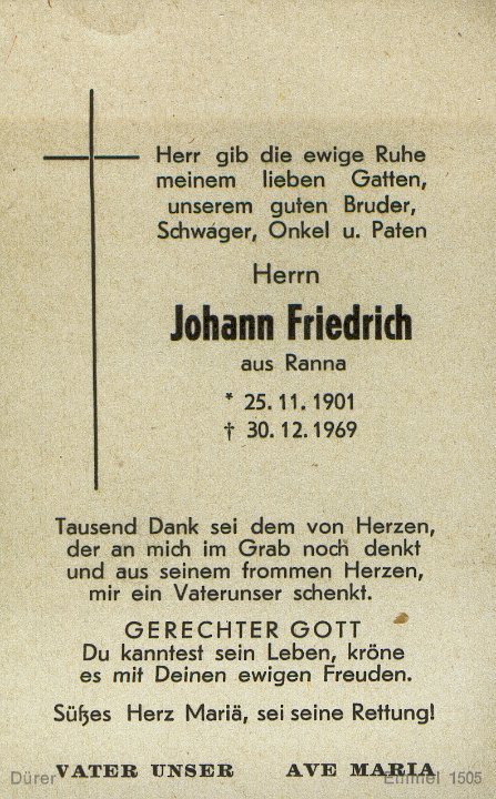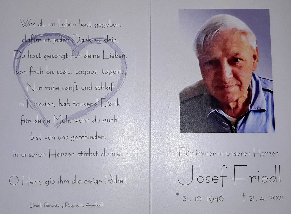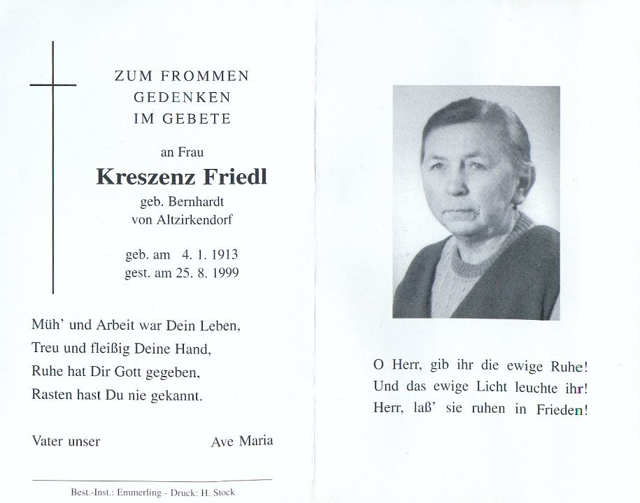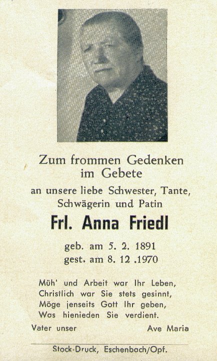Friedl Kreszenz geb Bernhardt 04.01.1913-25.08.1999 Friedl Reinhard 08.01.1974-02.09.2021 Friedrich Johann 25.11.1901-30.12.1969 Friedrich Magdalena geb Krieger 30.12.1904-14.02.1986