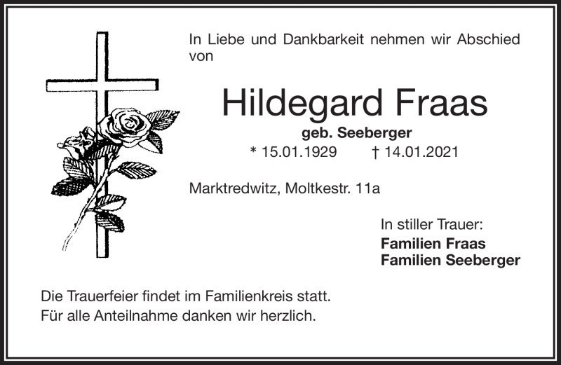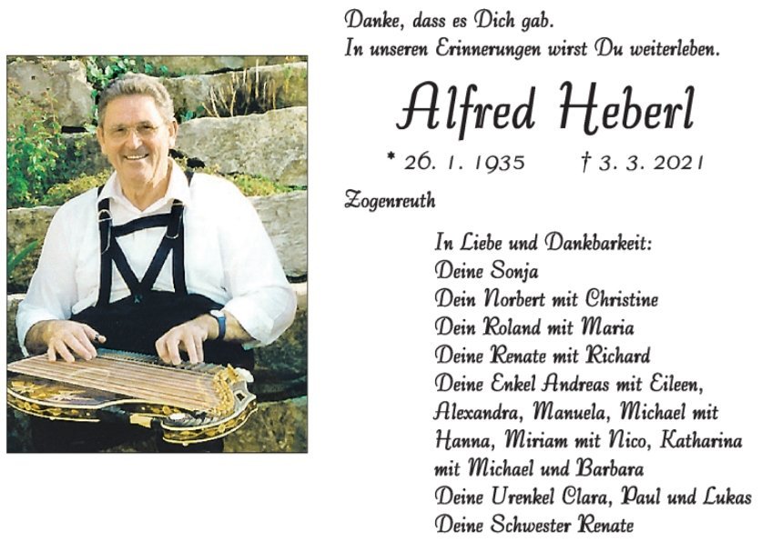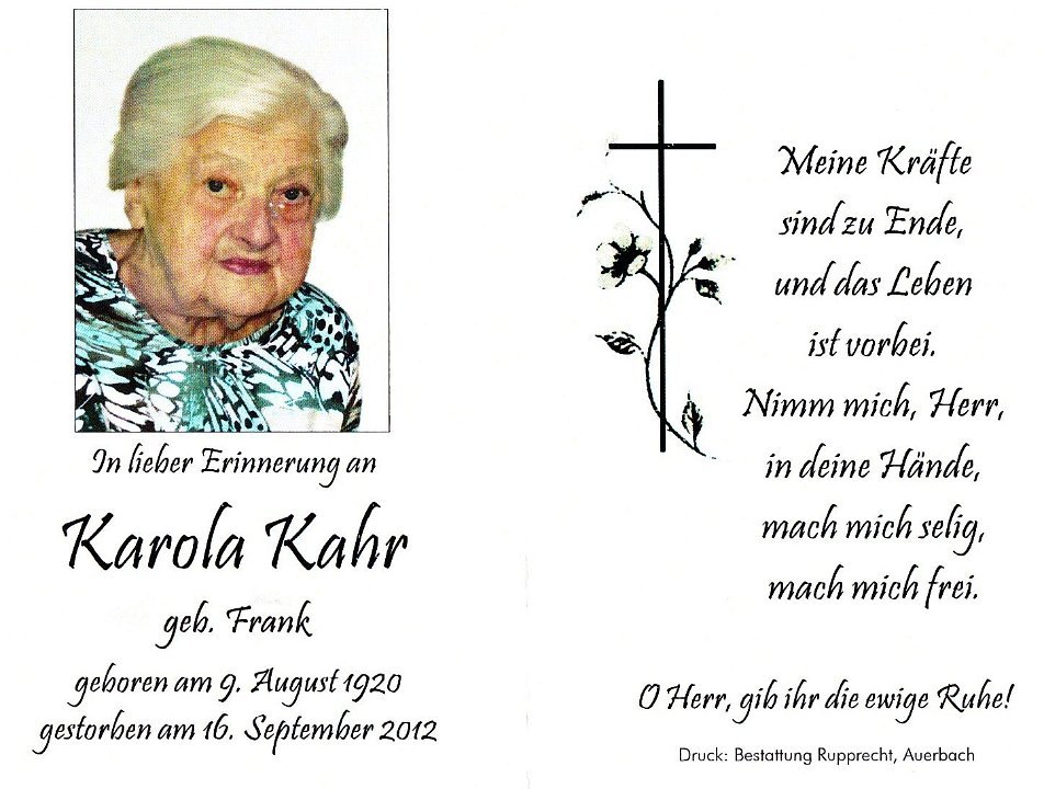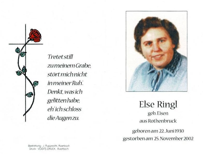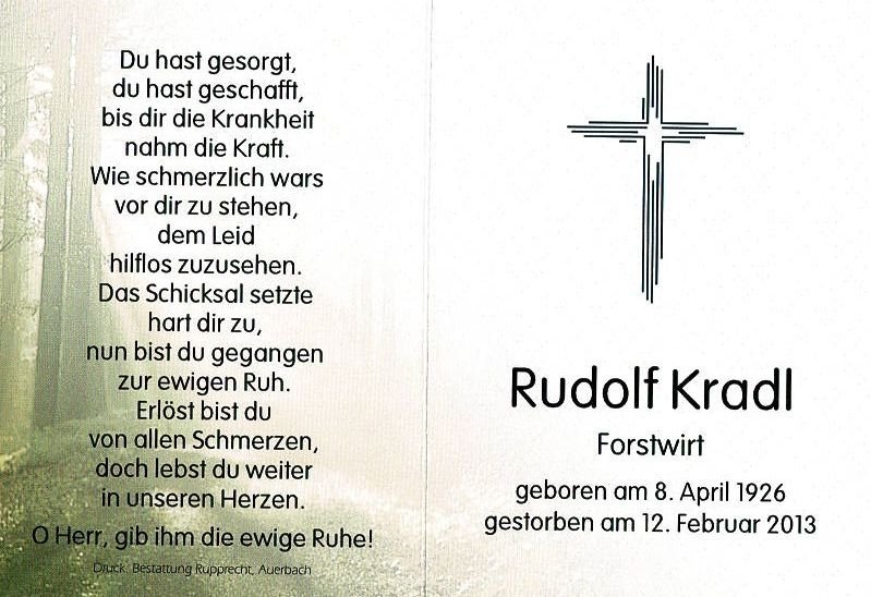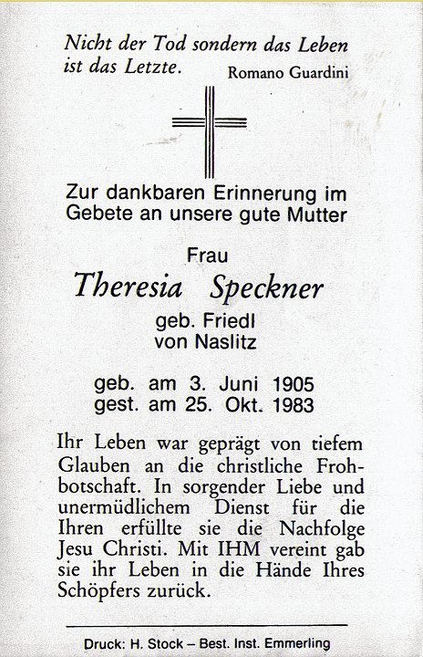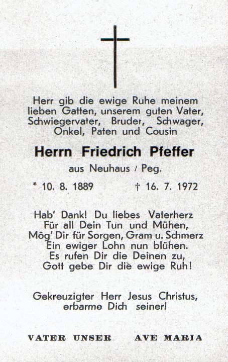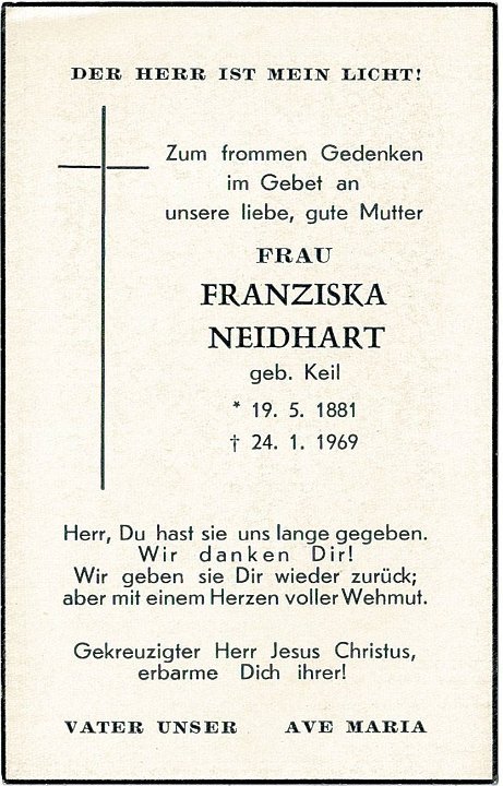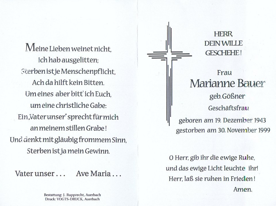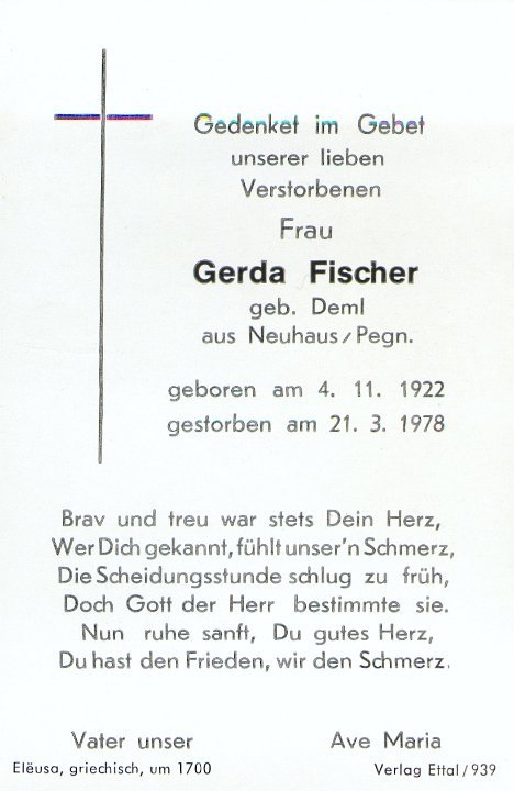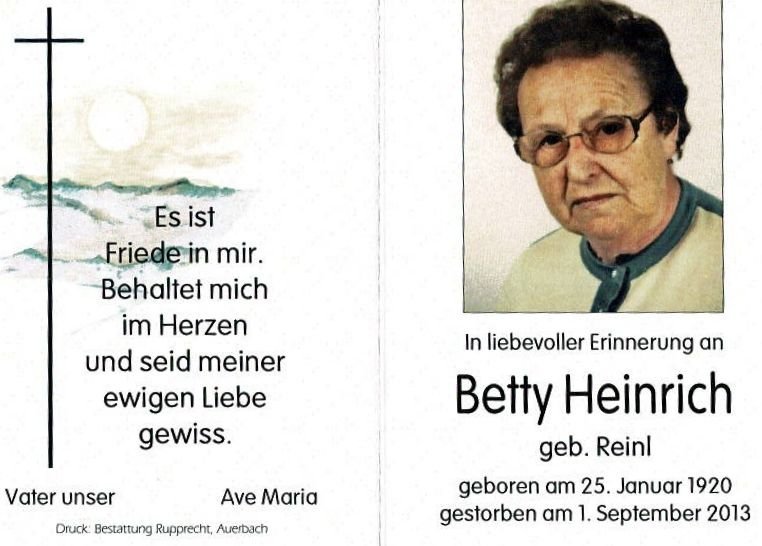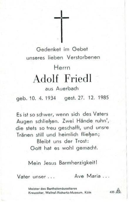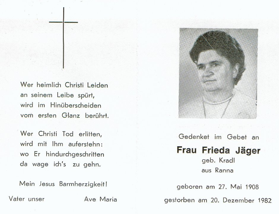 Friedl Kreszenz geb Bernhardt 04.01.1913-25.08.1999 Friedl Reinhard 08.01.1974-02.09.2021 Friedrich Johann 25.11.1901-30.12.1969 Friedrich Magdalena geb Krieger 30.12.1904-14.02.1986