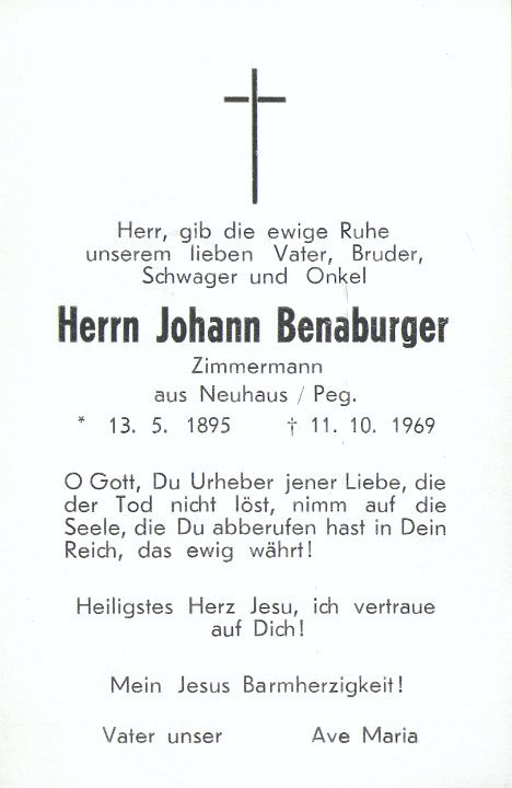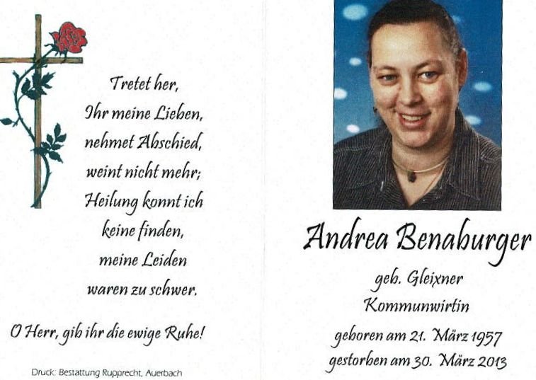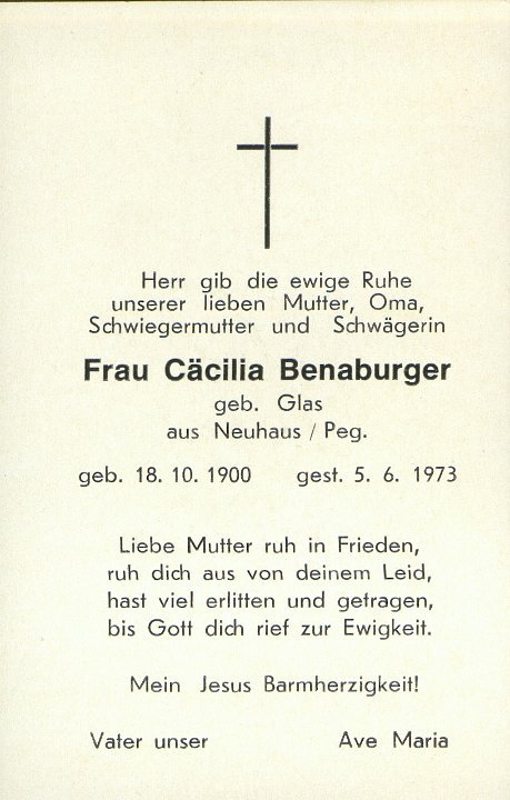 Belz Max 11.06.1932 - 13.11.2020 Benaburger Andrea geb. Gleixner 21.03.1957 - 30.03.2013 Benaburger Caecilia geb Glas 18.10.1900-05.06.1973 Benaburger Johann 13.05.1895-11.10.1969
