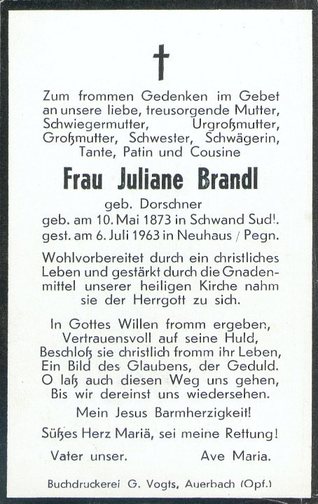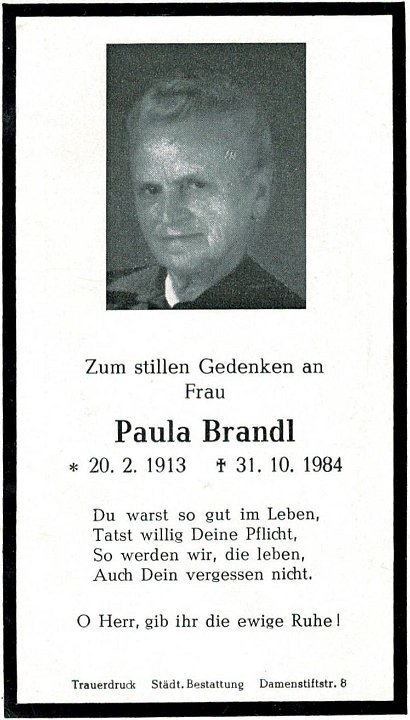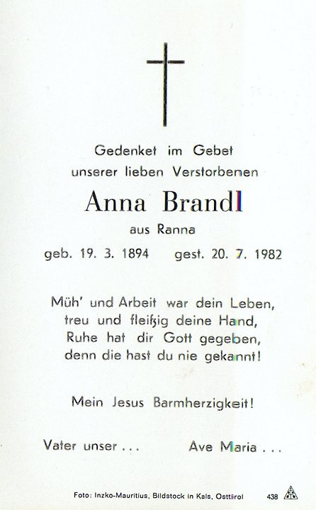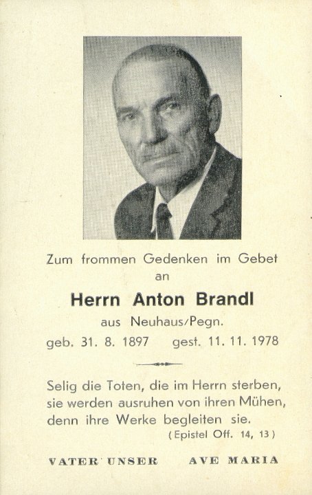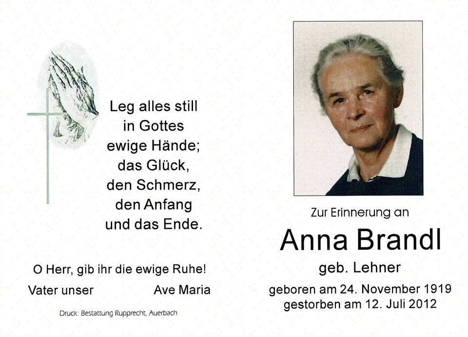 Brandl Anna 19.03.1894-20.07.1982 Brandl Anton 31.08.1897-11.11.1978 Brandl Juliane geb Dorschner 10.05.1873-06.07.1963 Brandl Walter 20.06.1921-27.08.2009