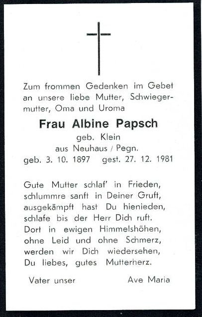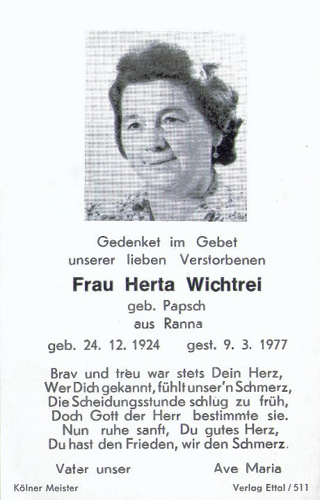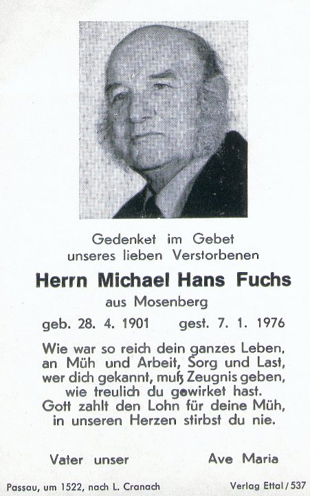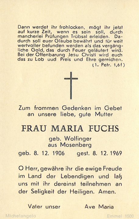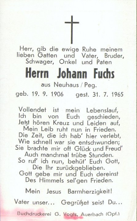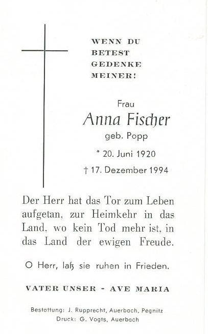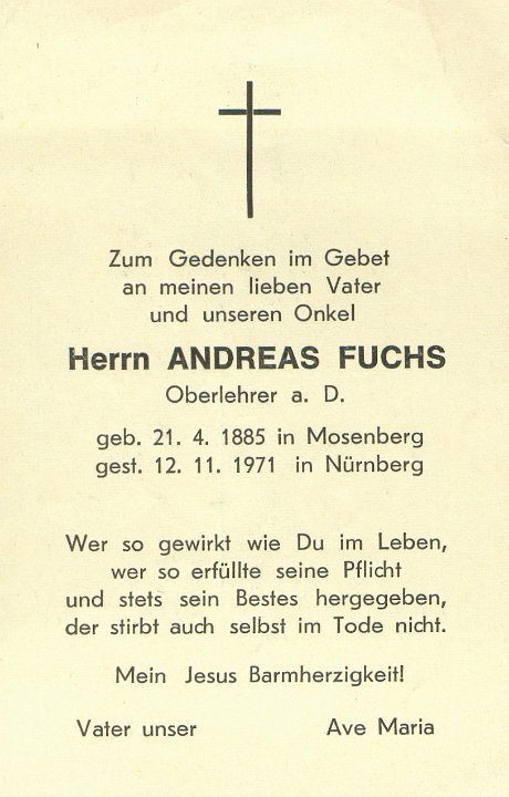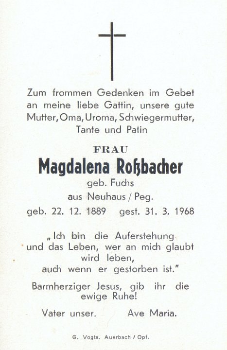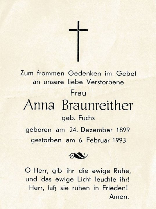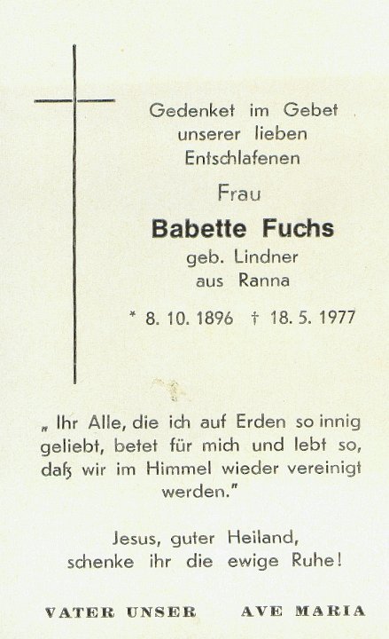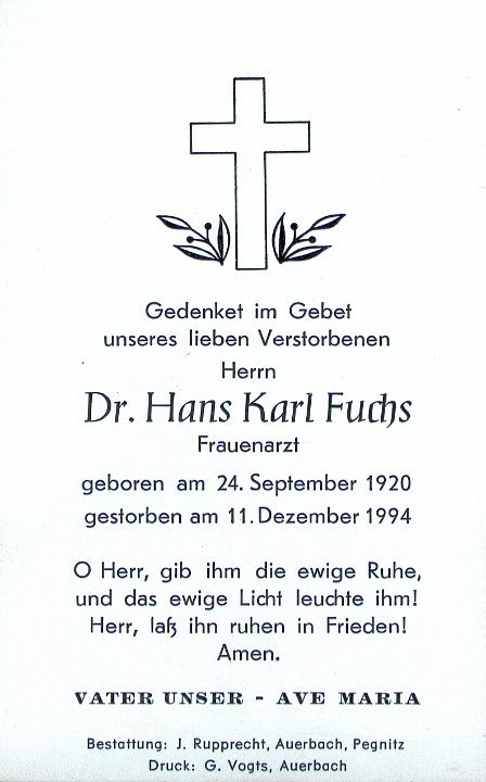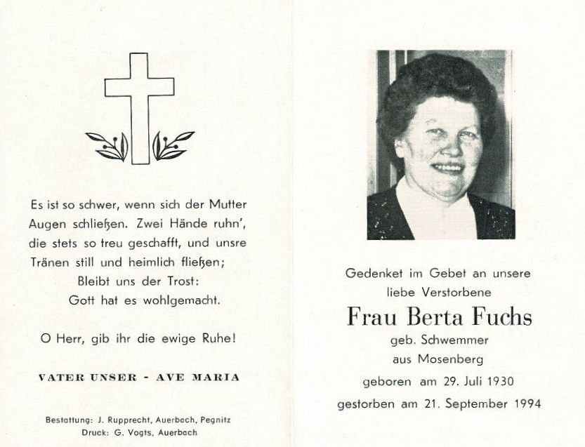 Fuchs Andreas 21.04.1885-12.11.1971 Fuchs Babette geb Lindner 08.10.1896-18.05.1977  Meine Oma Fuchs Berta geb. Schwemmer 29.07.1930 - 21.09.1994 SB Fuchs Dr. Hans-Karl 24.09.1920-11.12.1994  Mein Onkel