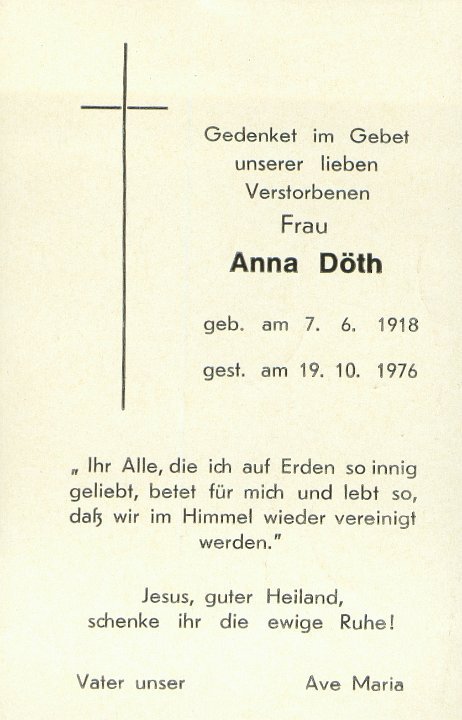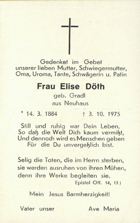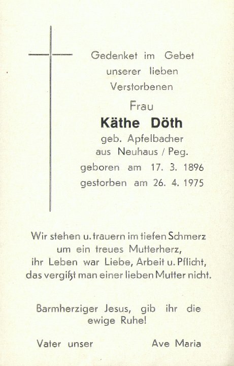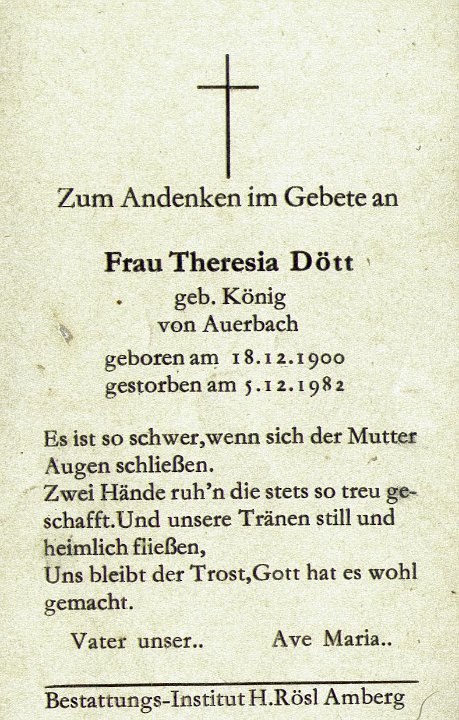 Döth Kaethe geb Apfelbacher 17.03.1896-26.04.1975 Döth Werner 31.03.1944 - 08.12.1975 SB Dött Teresia Koenig 18.12.1900-05.12.1982 Dümler Maria Magdalena 10.01.1895-19.05.1968