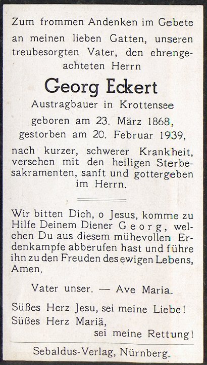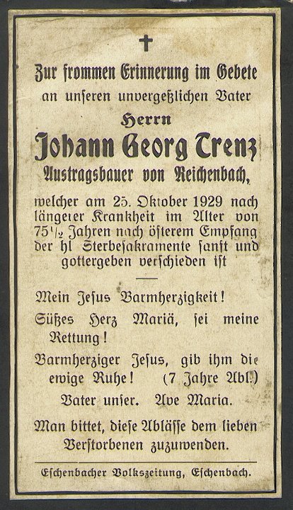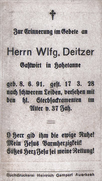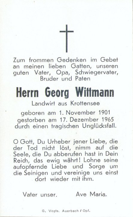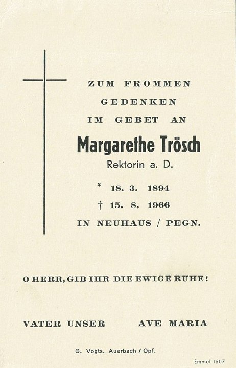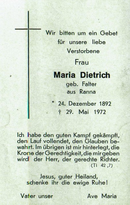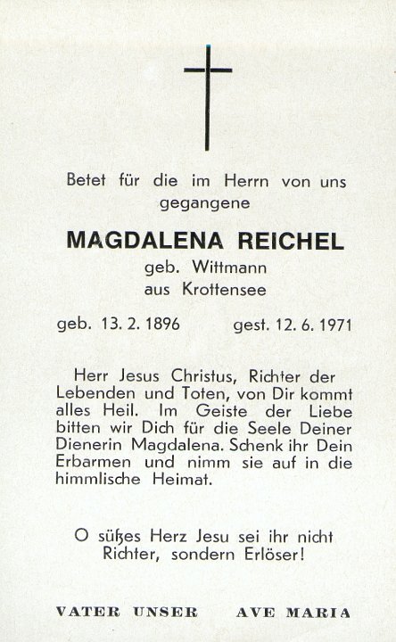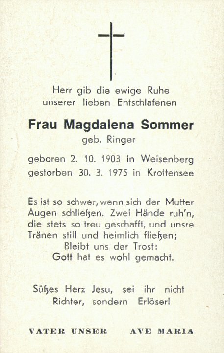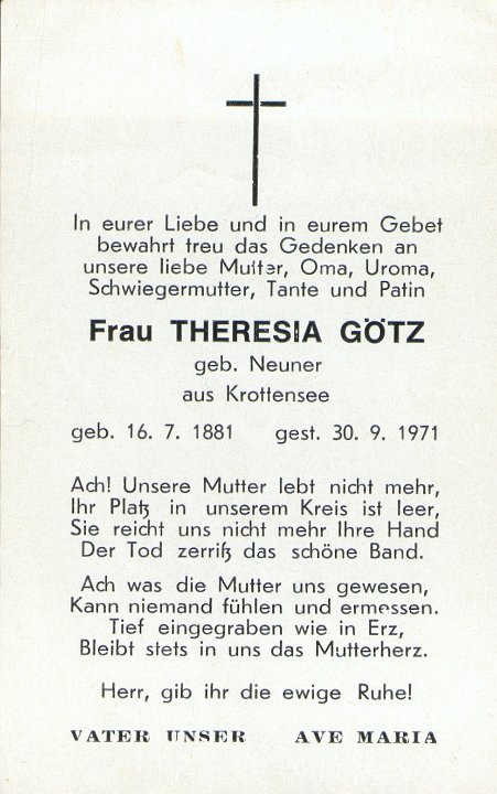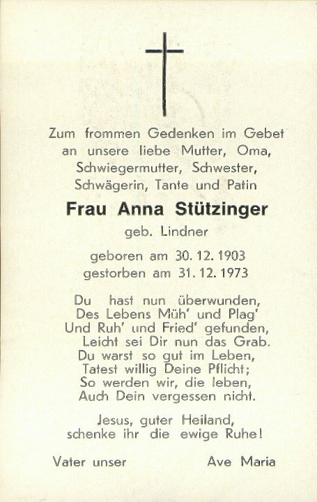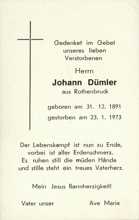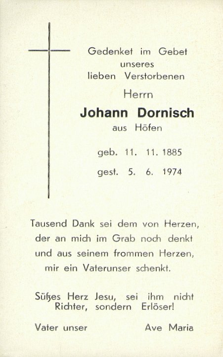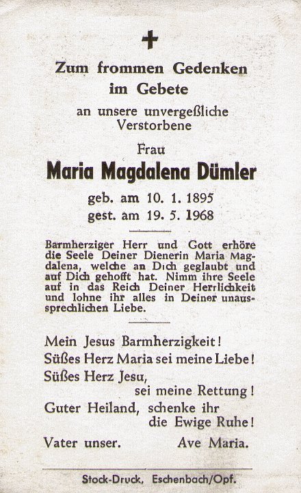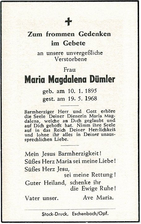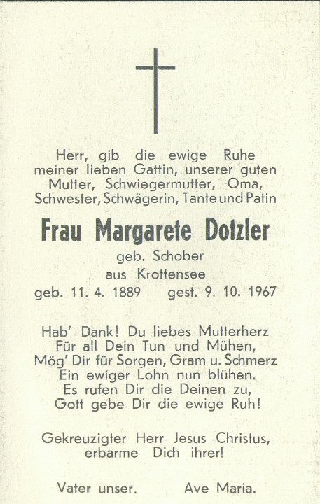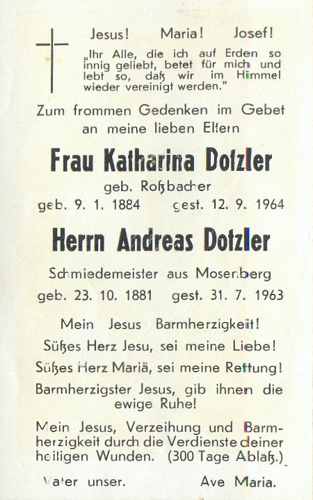 Dornisch Johann 11.11.1885-05.05.1974 Dotzler Katharina geb Rossbacher 09.01.1884-12.09.1964 und Andreas 23.10.1881-31.07.1963 Dotzler Margarete geb Schober 11.04.1889-09.10.1967 Duemler Maria Magdalena 10.01.1895 - 19.05.1968