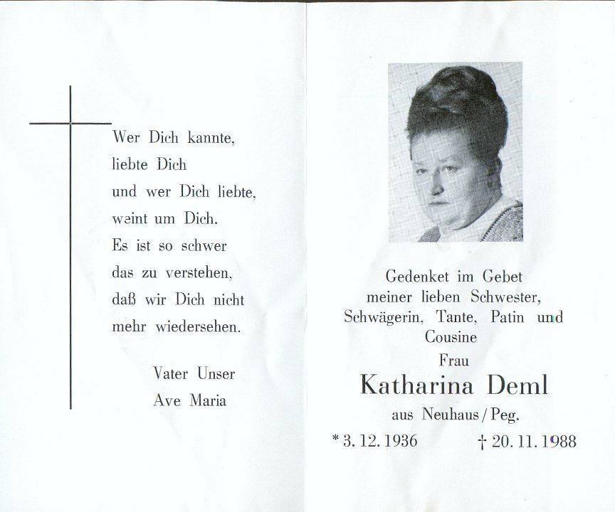 Deml Katharina 03.12.1936-20.11.1988 Deuerlein Willi 21.10.1913-24.06.1971 Dietrich Johann 17.01.1891-15.02.1976 Dietrich Josef 15.02.1889-18.01.1972