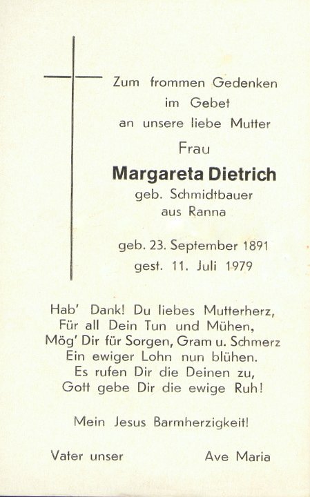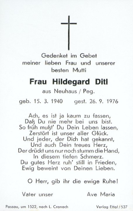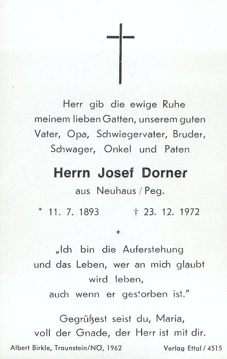 Dietrich Margareta geb Schmidtbauer 23.09.1891-11.07.1979 Dietrich Maria geb Falter 24.12.1892-29.05.1972 Ditl Hildegard 15.03.1940-26.09.1976 Dorner Josef 11.07.1893-23.12.1972