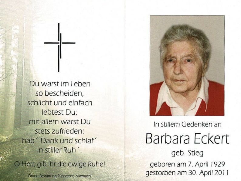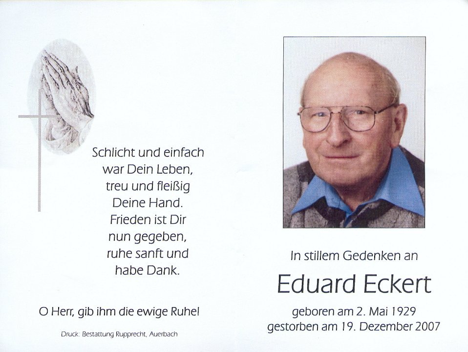 Eckert Barbara geb. Stieg - 07.04.1929 - 30.04.2011 SB Eckert Eduard 02.05.1929-19.12.2007 Eckert Georg 23.03.1868-20.02.1939 Eckert Heinz 23.09.1948-20.08.2023 SB