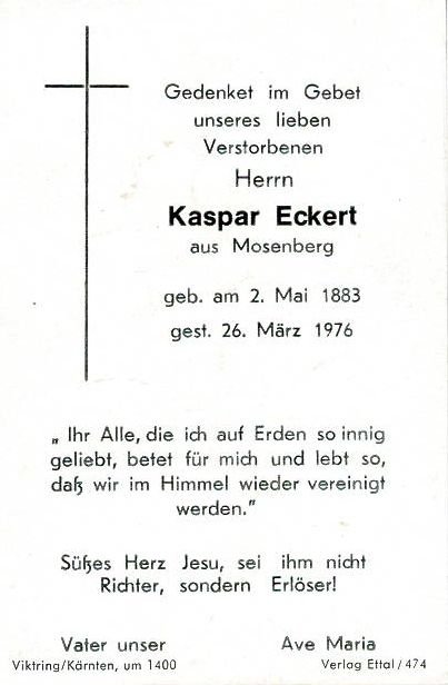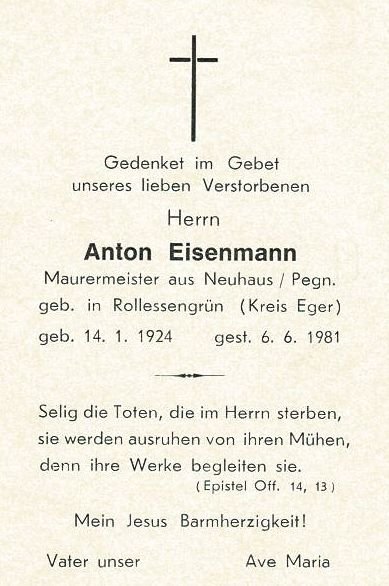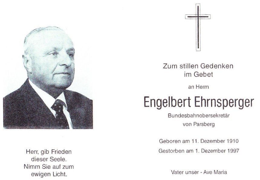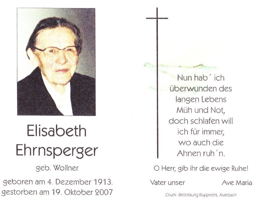 Eckert Kaspar - 02.05.1883 - 26.03.1976 SB Ehrnsberger Elisabeth geb. Wollner 4.12.1913 - 19.10.2007 Ehrnsberger Engelbert 11.12.1910 - 1.12.1997 Eisenmann Anton 14.01.1924 - 06.06.1981 SB