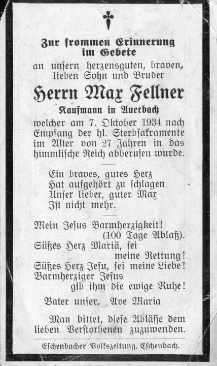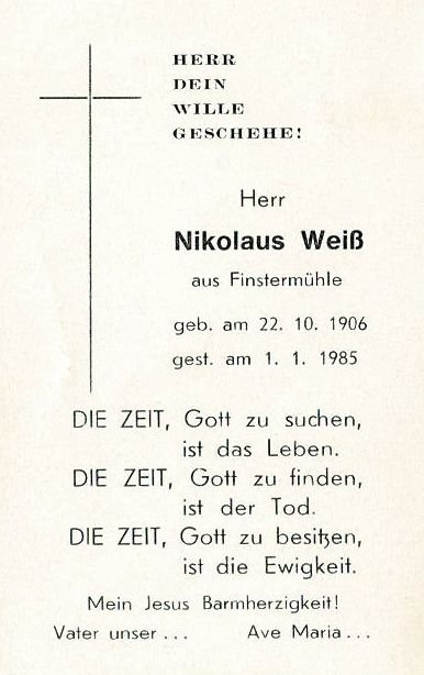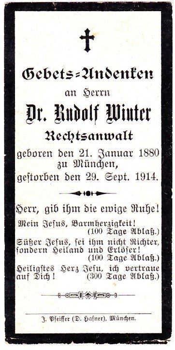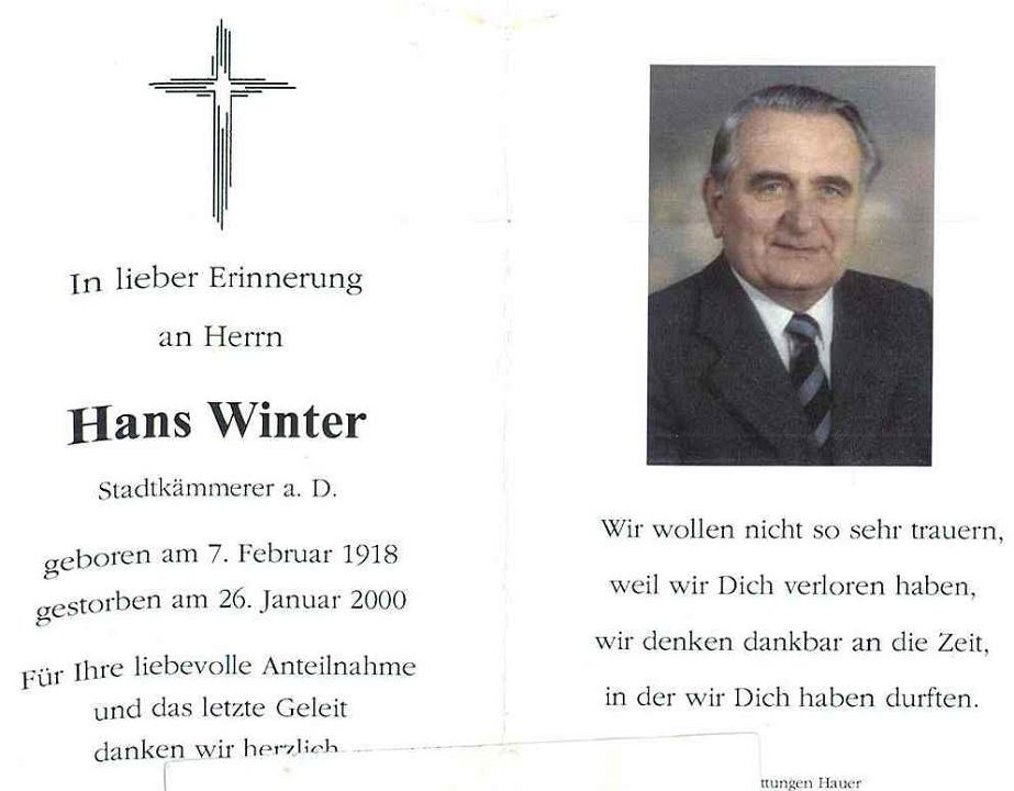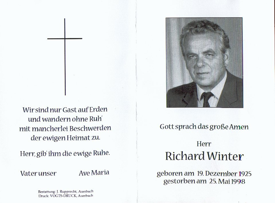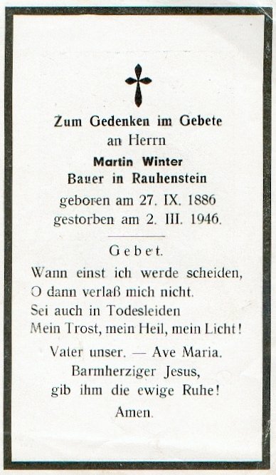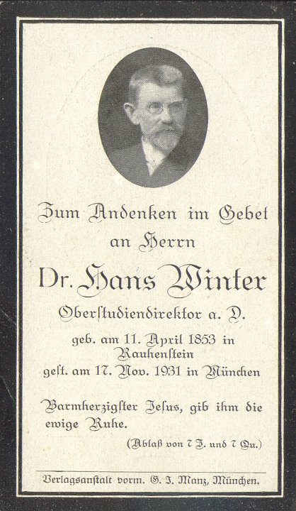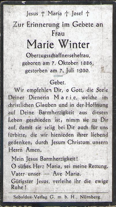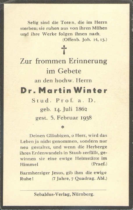 Winter Hans - 07.02.1918 - 26.01.2000 SB Winter Katharina geb. Leisner 27.06.1918 - 25.11.2011 SB Winter Maria geb. Sachsenweger 17.03.1922 - 11.03.1989 SB Winter Martin Dr. 50.Priesterjubilaeum 1886-1936