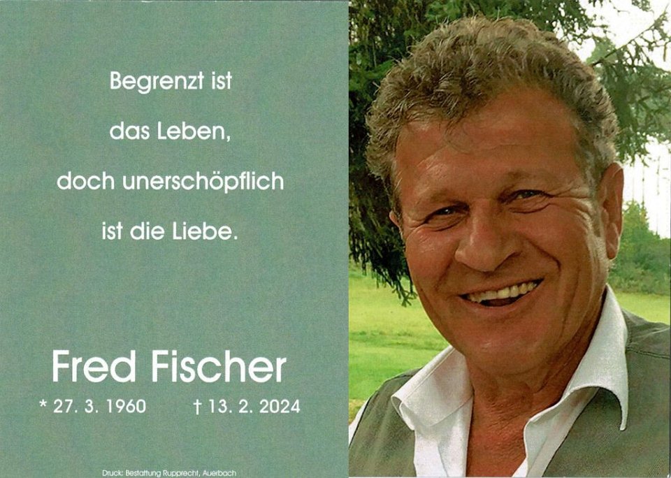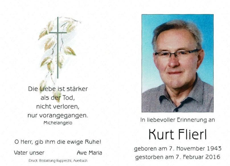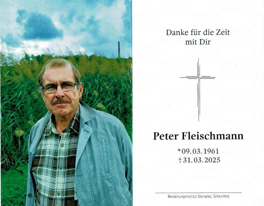 Fischer Gerda geb Deml 04.11.1922-21.03.1978 Fleischmann Peter 09.03.1961 31.03.2025  aus Oberlaimbach bei Scheinfeld - ehemaliger Mitarbeiter bei DB-Regio in Nürnberg Fliert Kurt 07.11.1943 - 07.02.2016 SB Foerster Brigitte geb Rupprecht 10.11.1886 - 15.11.1969