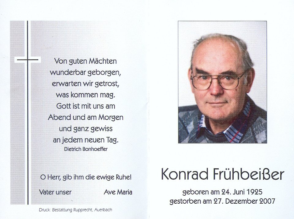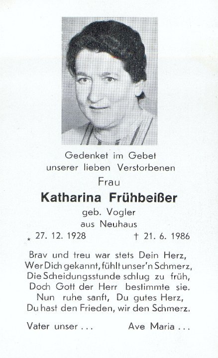 Frühbeisser Katharina geb Vogler 27.12.1928-21.06.1986 Frühbeisser Konrad 24.06.1925-27.12.2007 Fuchs Erich 20.08.1929 - 15.12.1990 Fuchs Georg 14.01.1928 - 19.03.2012