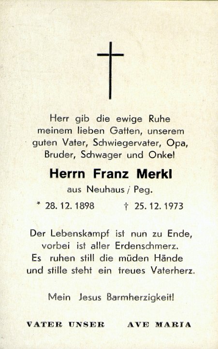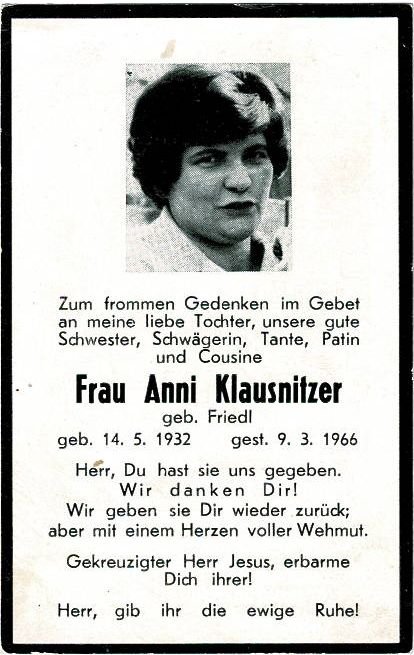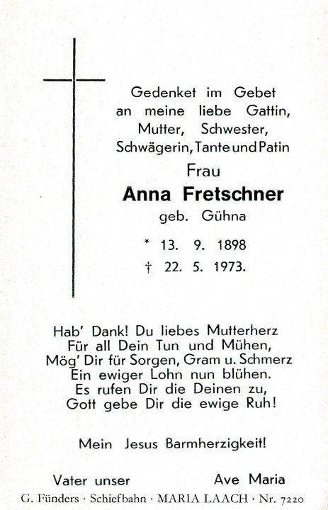 Fretschner Anna geb Guehna 13.09.1898 - 22.05.1973 Friedl Johann 28.05.1945-12.04.2020 Friedl Margarete 28.03.1896 - 15.01.1972 Friedl Martin 01.08.1937 - 27.12.1993