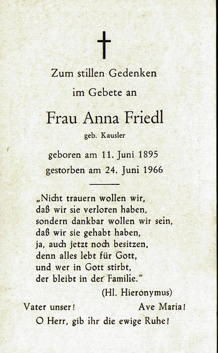Friedl Anna 05.02.1891-08.12.1970 Friedl Anna geb Kausler 11.06.1895-24.06.1966 Friedl Anna geb. Scharf 20.10.1906 - 07.09.1980 SB Friedl Josef 31.10.1946-21.04.2021