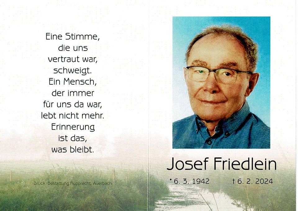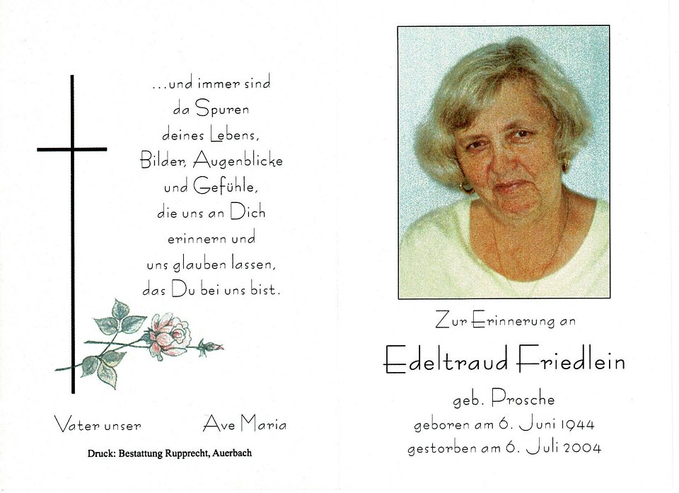 Friedlein Edeltraud geb. Prosche 06.06.1944-06.07.2004 SB Friedlein Josef 06.03.1942-06.02.2024 SB Friedlein Margarete geb Suttner 23.04.1888-04.06.1969 Friedl Adolf 10.04.1934 - 27.12.1985 SB
