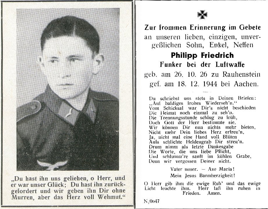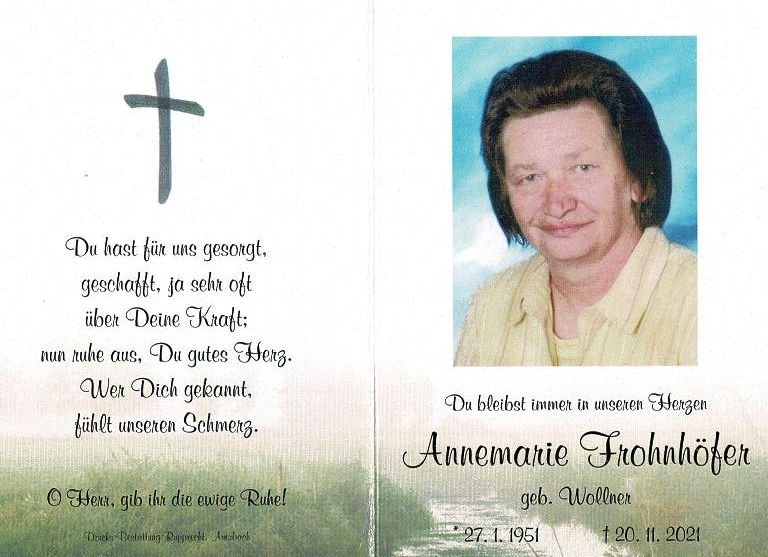 Friedrich Philipp 26.10.1926-18.12.1944 Fried Baptist 12.01.1900 - 02.06.1959 SB Frohhöfer Margaretha 14.03.1896-26.06.1930 Frohnhöfer Annemarie geb Wollner 27.01.1951-20.11.2021
