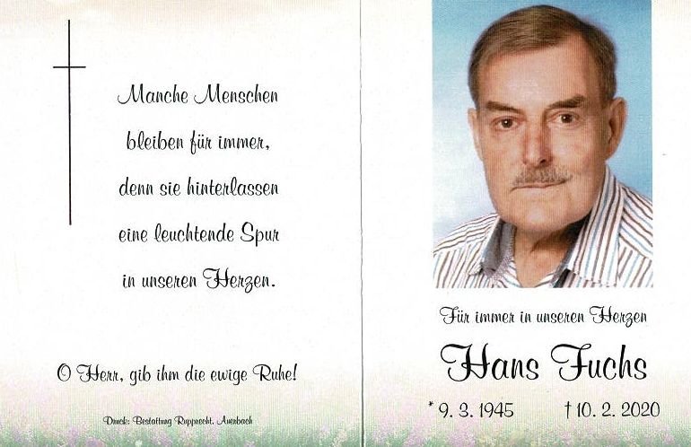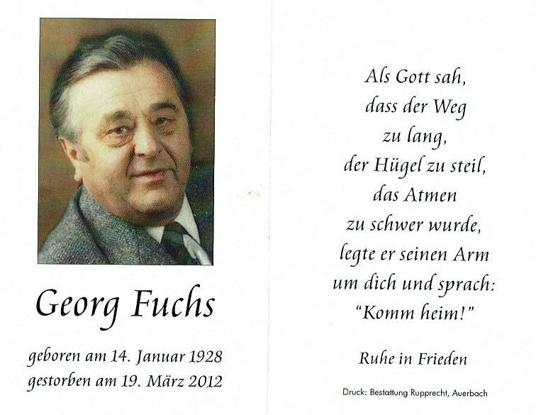 Fuchs Gunda geb. Apfelbacher 03.08.1933 - 25.08.2019 Fuchs Hans 09.03.1945 - 10.02.2020 Fuchs Hans 20.08.1954 - 31.01.2013 Fuchs Karl 16.05.1933 - 29.10.2020