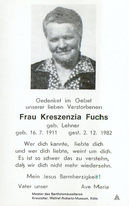 Fuchs Inge geb Haschke 23.07.1926 - 16.08.2014  Meine Tante Fuchs Johann 19.09.1906-31.07.1965 Fuchs Kreszensia geb Lehner 16.07.1911-02.12.1982 Fuchs Maria geb Wolfinger 08.12.1906-08.12.1969