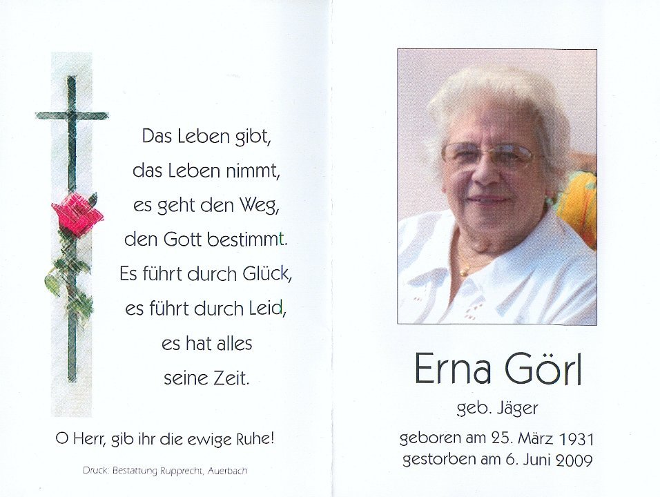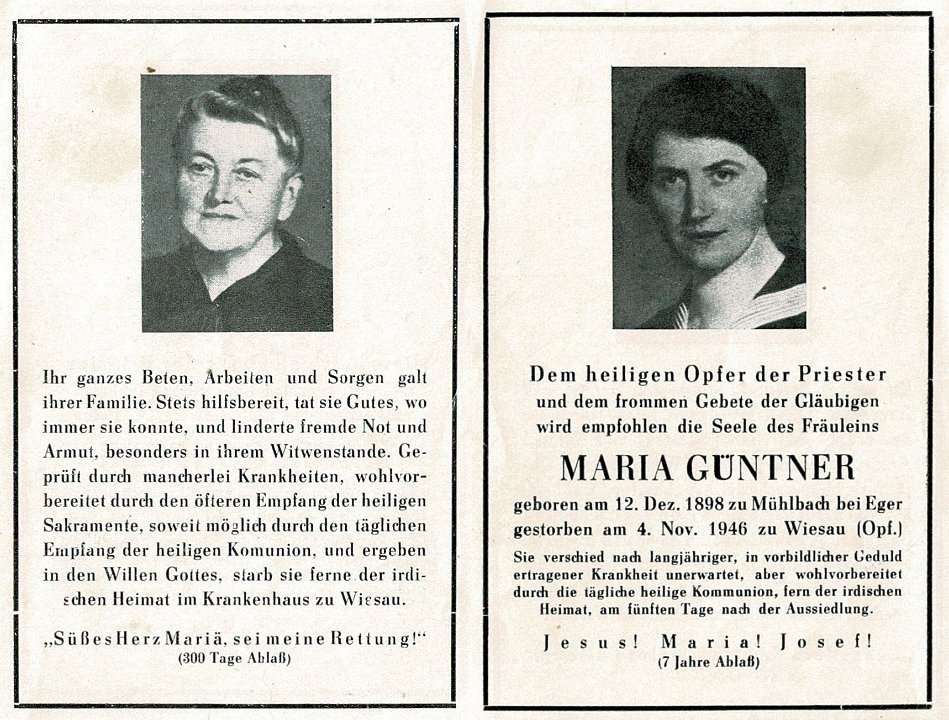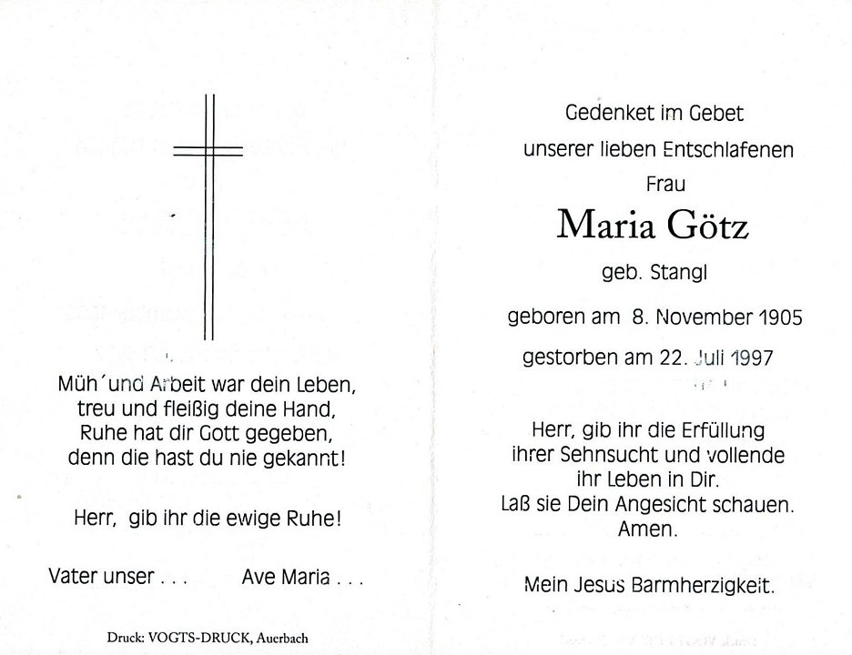 Guentner Maria geb 12.12.1898 - 04.11.1946 Guentner Johanna geb Lang 11.01.1949-18.12.2008 Görl Erna geb Jäger 25.03.1931-06.06.2009 Götz Maria geb. Stangl 08.11.1905-22.07.1997 SB