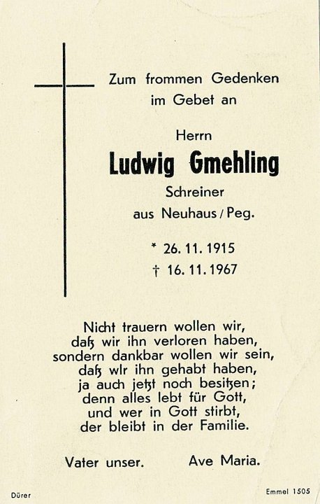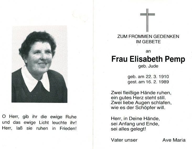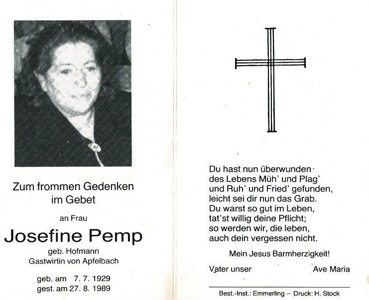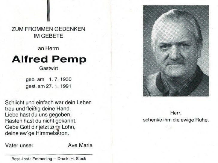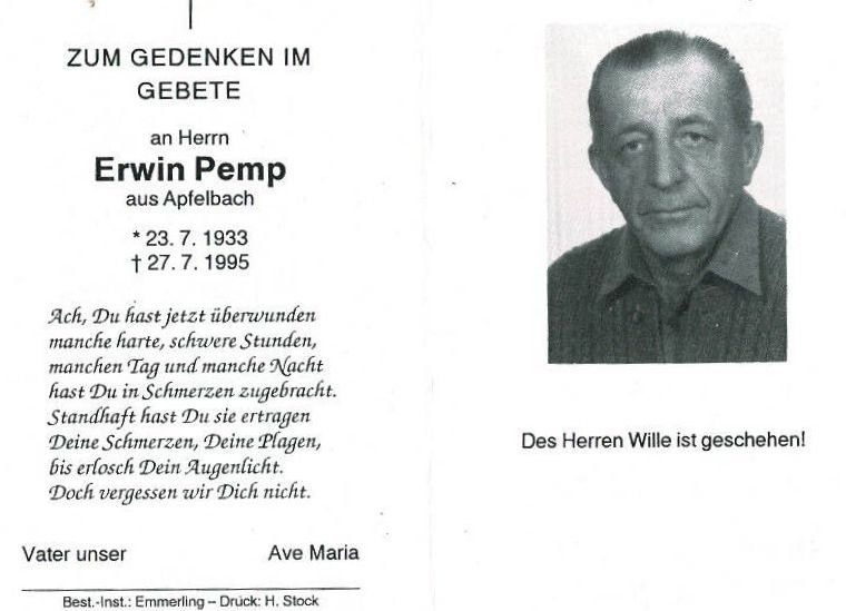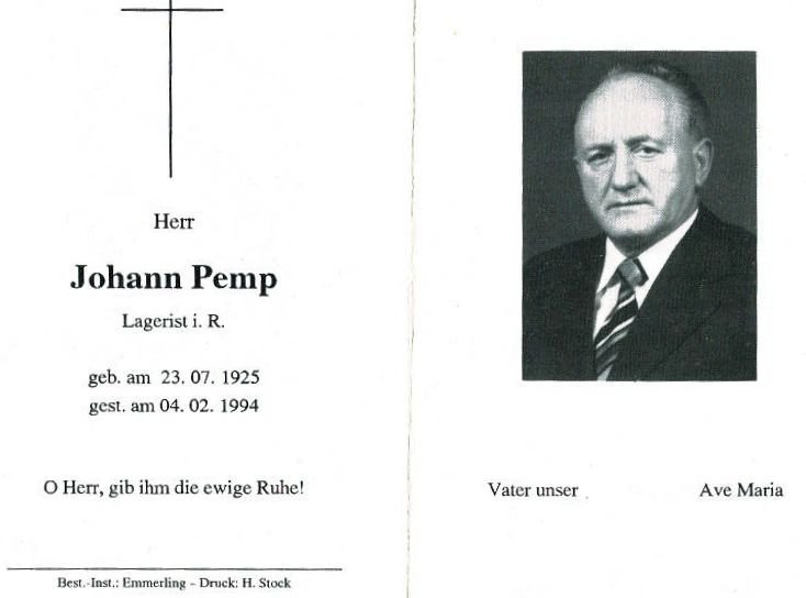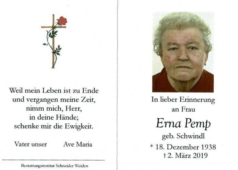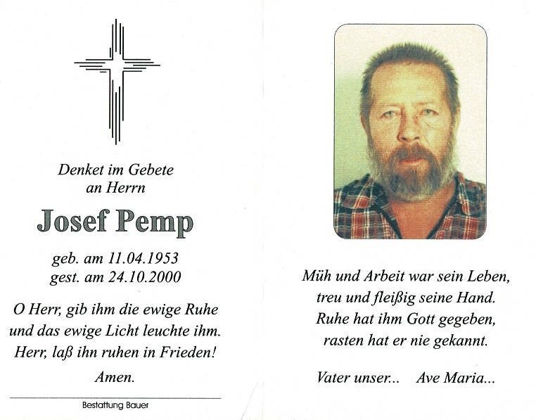 Pemp Erna geb. Schwindl 18.12.1938 - 02.03.2019 Pemp Erwin 23.07.1933 - 27.07.1995 Pemp Johann 23.07.1925 - 04.02.1994 Pemp Josef 11.04.1953 - 24.10.2000
