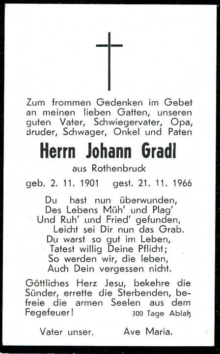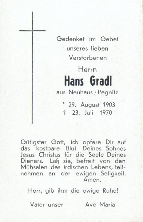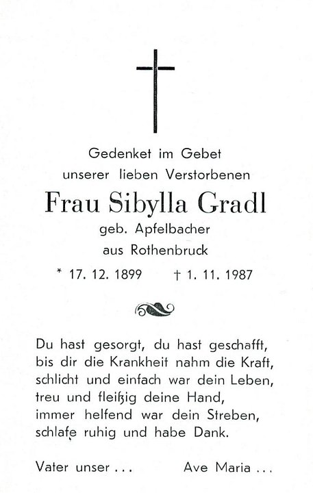 Gradl Johann 02.11.1901 - 21.11.1966 Gradl Hans 29.08.1903-23.07.1970 Gradl Karl 04.08.1926-08.10.1999 SB Gradl Sibylla geb. Apfelbacher 17.12.1899-01.11.1987 SB