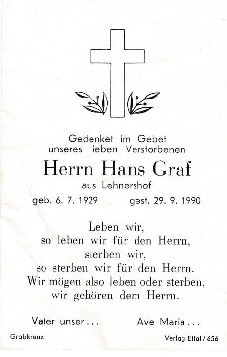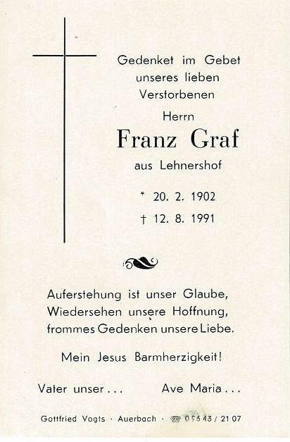 Graf Hans 06.07.1929 - 29.09.1990 Graf Anna geb Regn 02.10.1902-15.09.1984 Graf Franz geb. 20.02.1902 - 12.08.1991 SB Graf Helmut 16.03.1944-22.07.2006