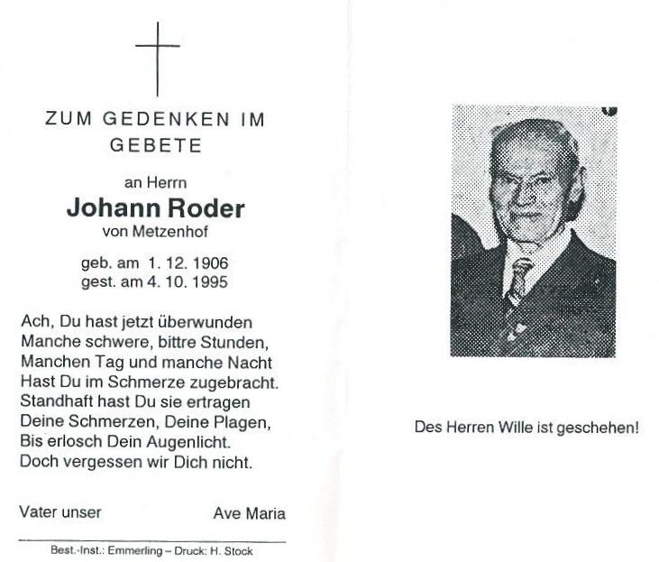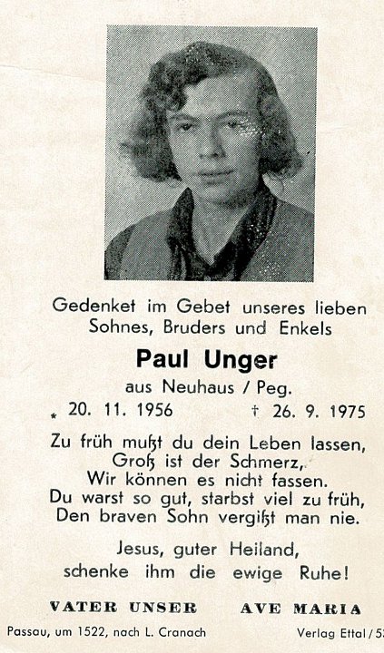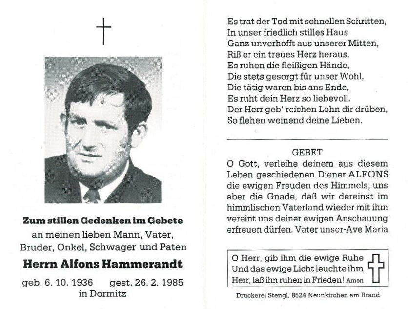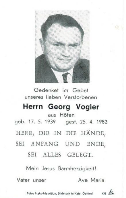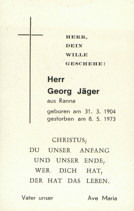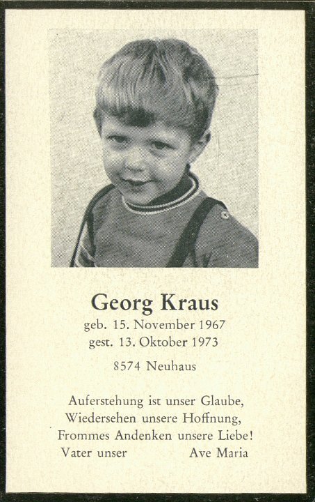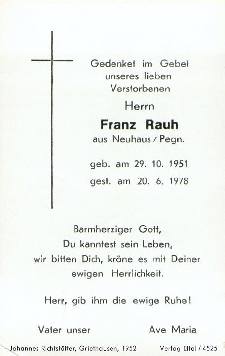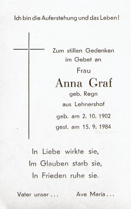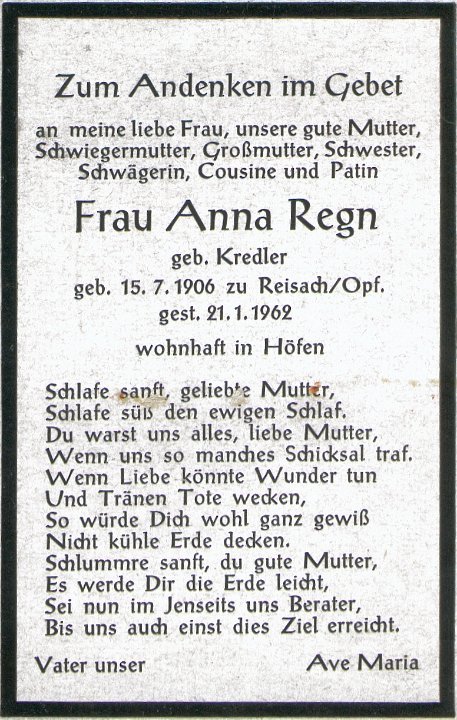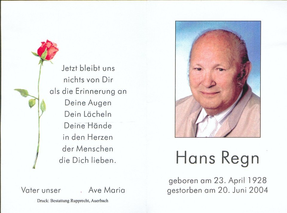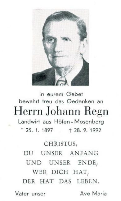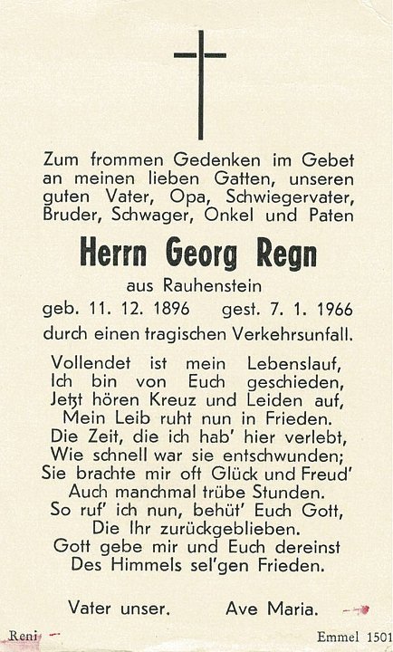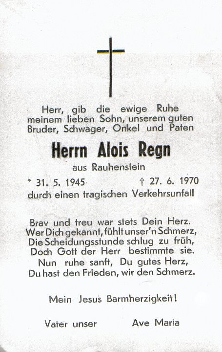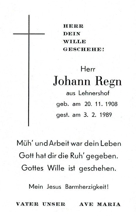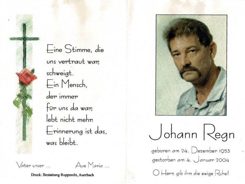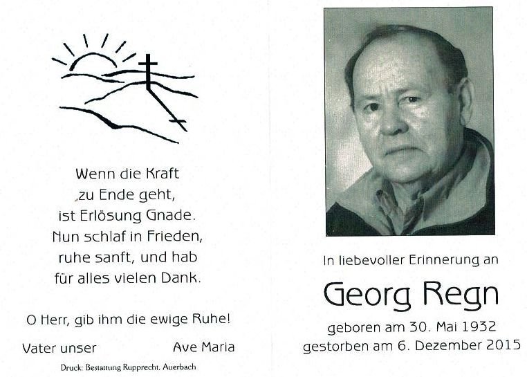 Regn Georg 30.05.1932 - 06.12.2015 Regn Johann 20.11.1908 - 03.02.1989 Regn Johann 24.12.1953 - 04.01.2004 Regn Alois 31.05.1945-27.06.1970