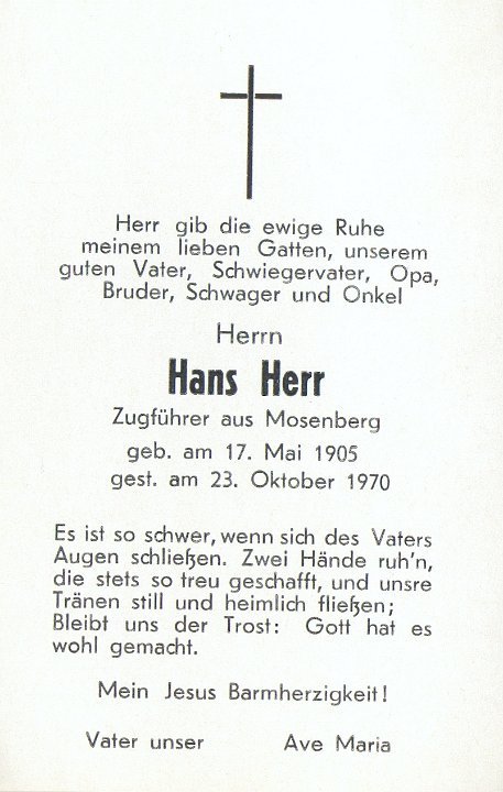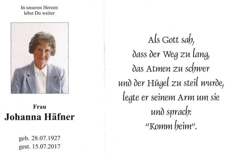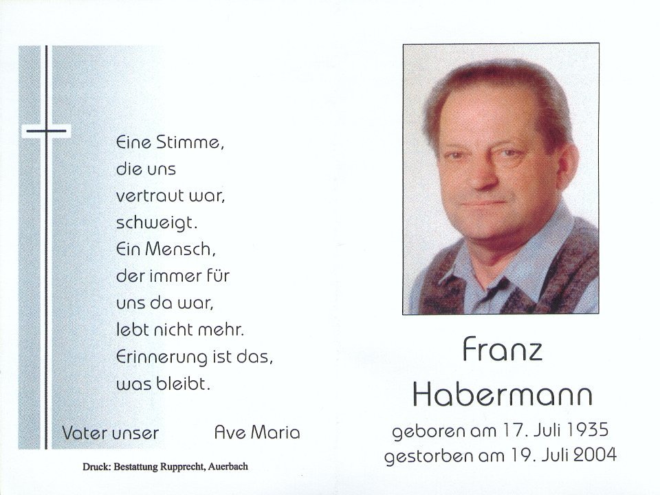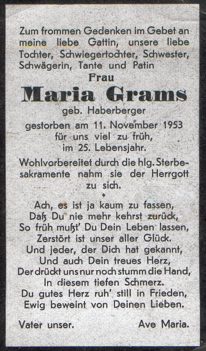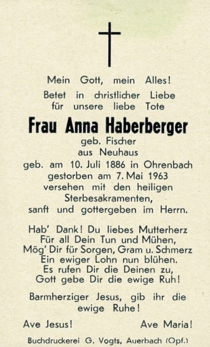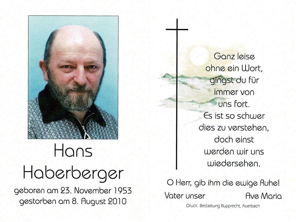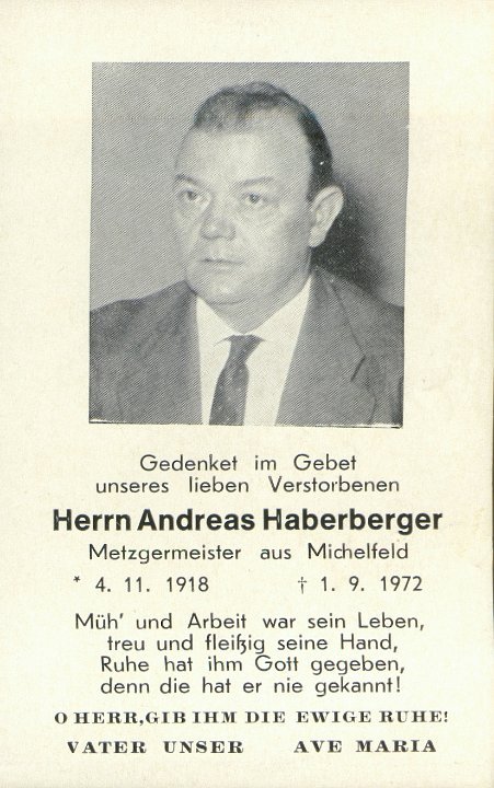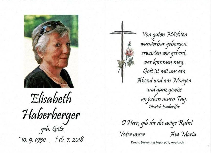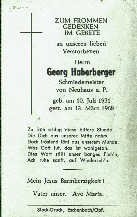 Haberberger Elisabeth geb Goetz 10.09.1950 - 17.07.2018 Haberberger Hans 23.11.1953 - 08.08.2010 Haberberger Andreas 04.11.1918-01.09.1972 Haberberger Georg 10.07.1921-13.03.1968