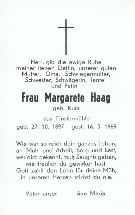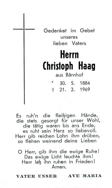 Götz Theresia geb Neuner 16.07.1881-30.09.1971 Haag Christopf 30.05.1884 - 21.02.1969 Haag Margarete geb Kurz 27.10.1897-16.05.1969 Haberberger Anna geb Fischer 10.07.1886 - 07.05.1963