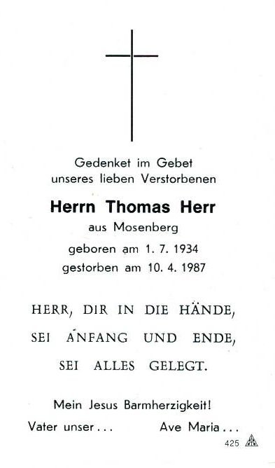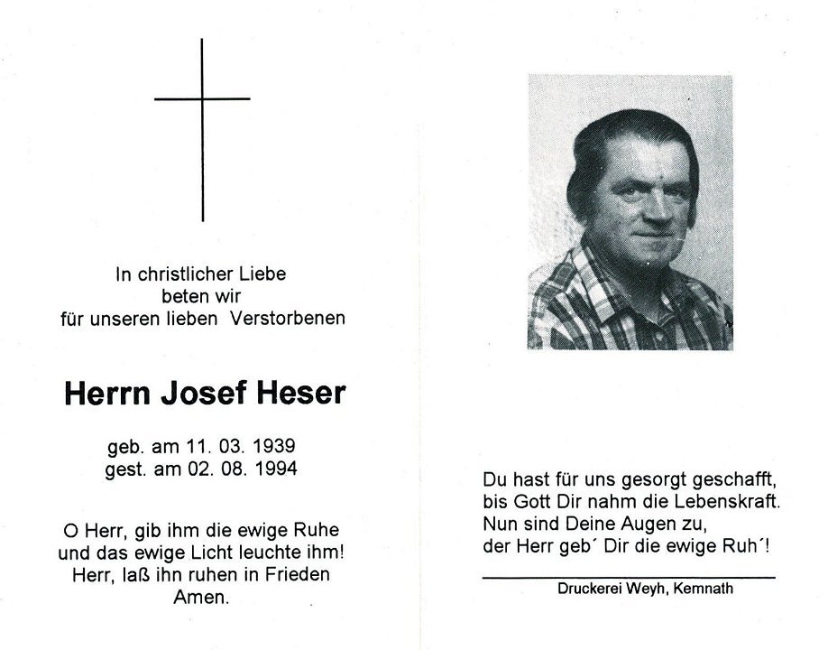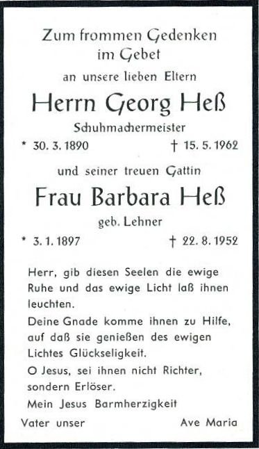 Herr Thomas 01.07.1934 - 10.04.1987 SB Heser Josef 11.03.1939 - 02.08.1994 Heß Barbara geb. Lehner 03.01.1887 - 22.08.1952 SB Heß Georg 30.03.1890 - 15.05.1962 SB