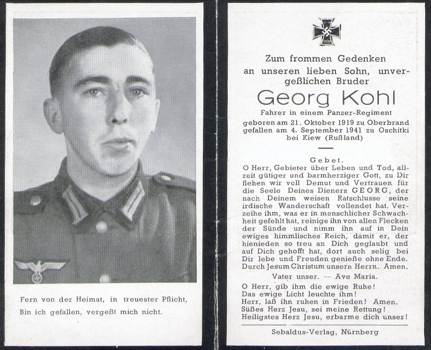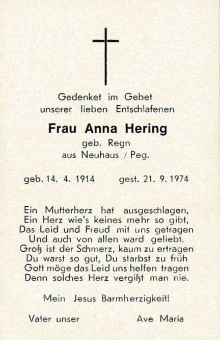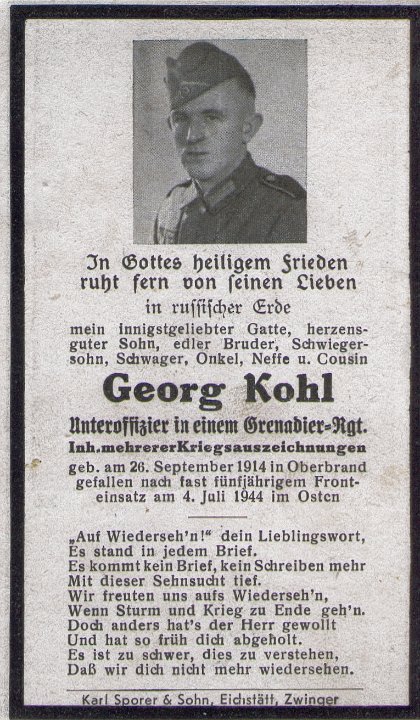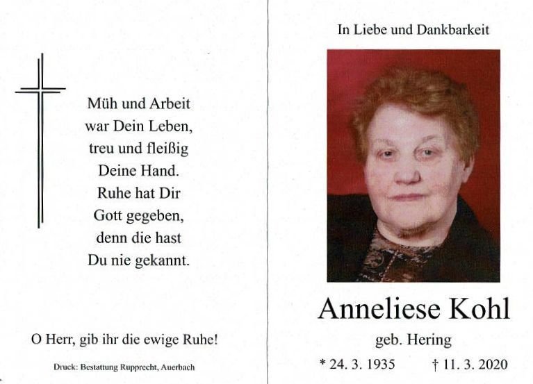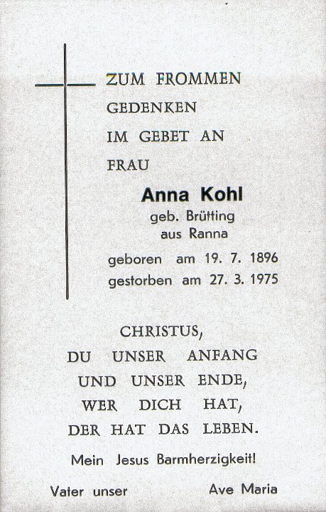 Kohl Anneliese geb. Hering 24.03.1935 - 11.03.2020 Kohl Anna geb Bruetting 19.07.1896-27.03.1975 Kohl Georg 21.10.1919-04.09.1941 Kohl Georg 26.09.1914-04.07.1944
