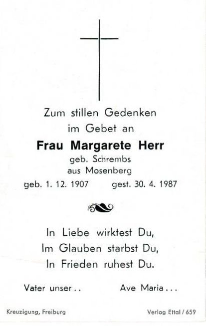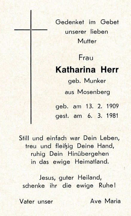 Hermann Magdalena geb Deinzer 11.08.1900-14.2.1982 Herr Katharina geb Munker 13.02.1909 - 06.03.1981 Herr Hans 17.05.1905-23.10.1970 Herr Margarete geb. Schrembs 01.12.1907 - 30.04.1987 SB
