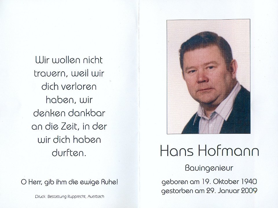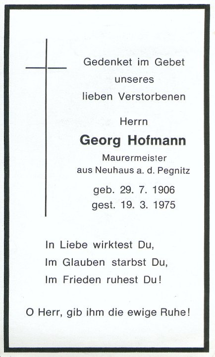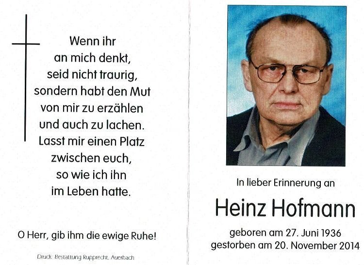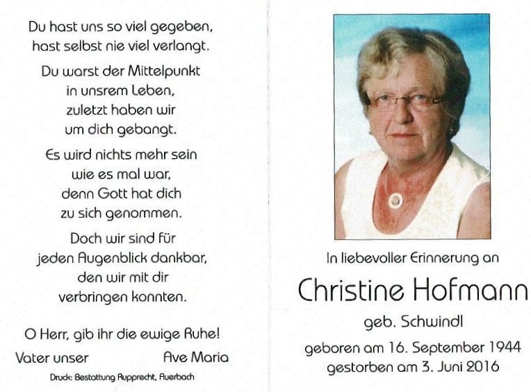 Hofmann Christine geb. Schwindl 16.09.1944 - 03.06.2016 Hofmann Heinz 27.06.1936 - 20.11.2014 Hofmann Georg 29.07.1906-19.03.1975 Hofmann Hans 19.10.1940-29.01.2009