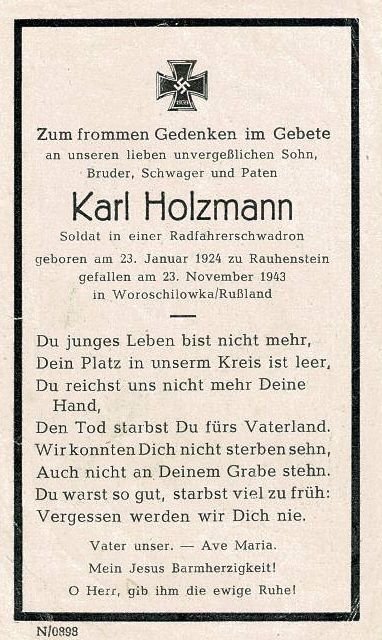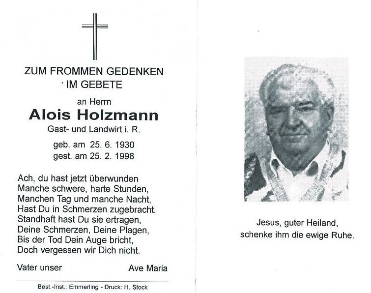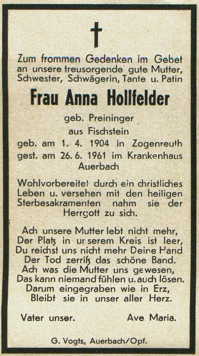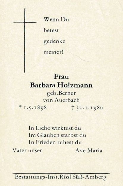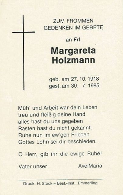 Hollfelder Anna geb Preiniger 01.04.1904-26.06.1961 Holzmann Alois 25.06.1930 - 25.02.1998 SB Holzmann Barbara geb. Berner 01.05.1898 - 30.01.1980 SB Holzmann Karl 23.01.1924 - 23.11.1943 SB