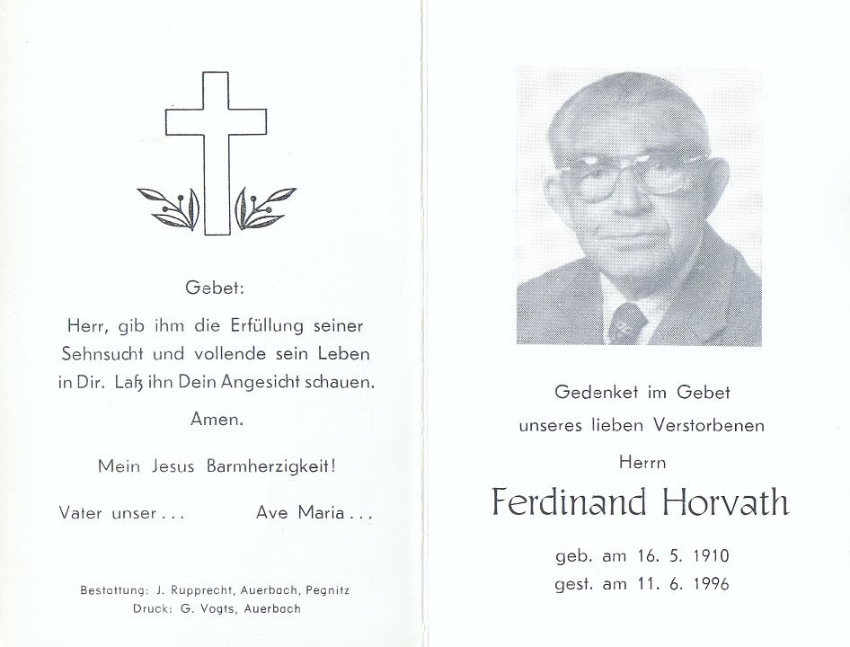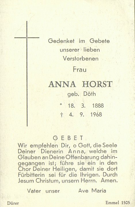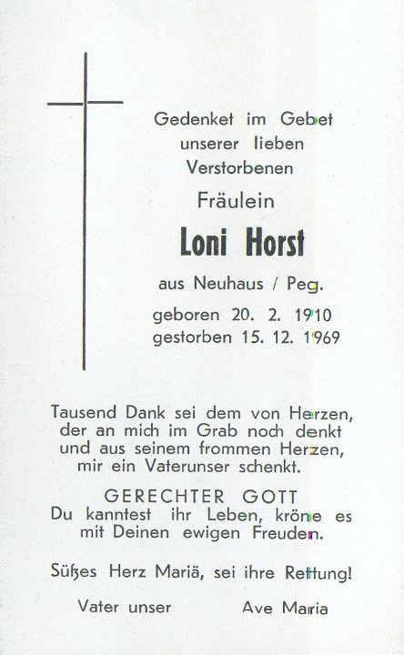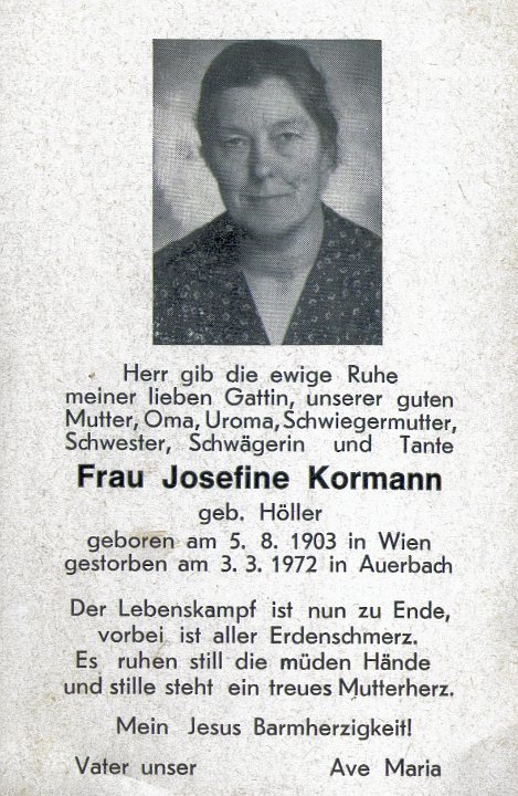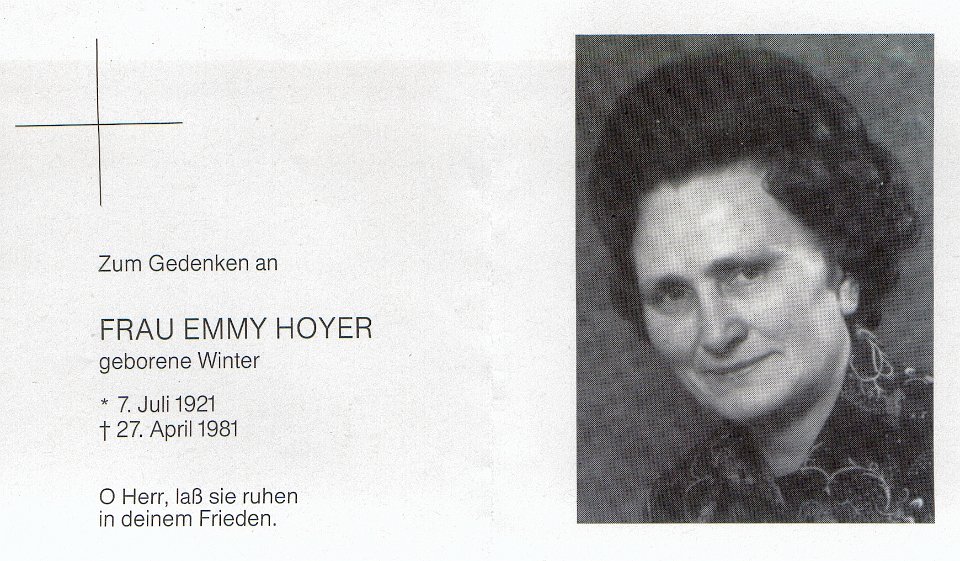 Horst Loni 20.02.1910-15.12.1969 Horvath Ferdinand 16.05.1910-11.06.1996 Hoyer Emmy geb Winter 07.07.1921-27.04.1981  Meine Tante Häfner Johanna geb. Duerler 28.07.1927 - 15.07.2017
