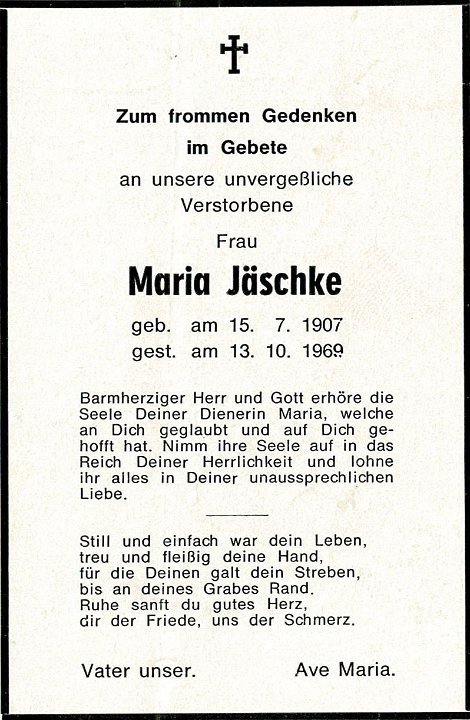 Jäschke Maria 15.07.1907 - 13.10.1969 Kahr Karola geb. Frank 09.08.1920-16.09.2012 Kampf Marie 31.05.1891 - 15.03.1970 Kaufmann Marga geb Fuchs 19.12.1926 - 06.01.2021 SB