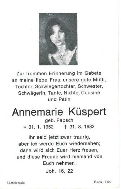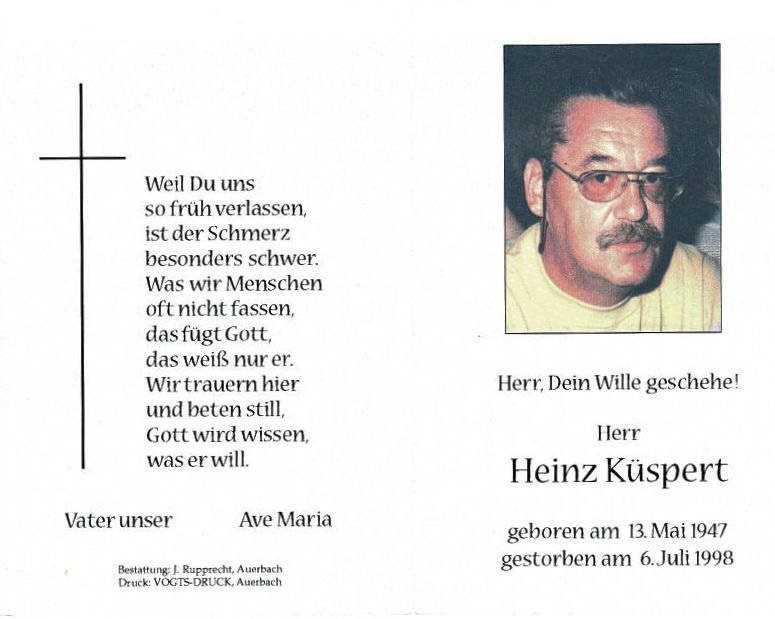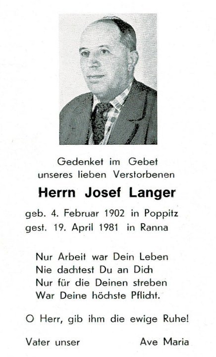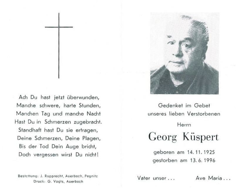 Küspert Annemarie geb. Papsch 31.01.1952 - 31.08.1982 SB Küspert Georg 14.11.1925 - 13.06.1996 SB Küspert Heinz 13.05.1947 - 06.07.1998 SB Langer Josef 04.02.1902 - 19.04.1981