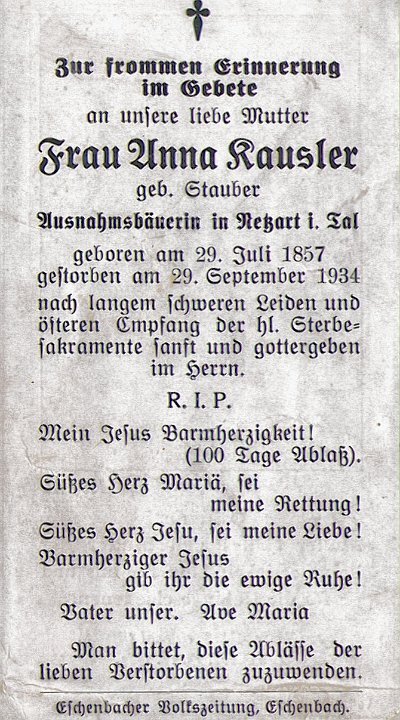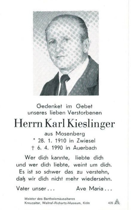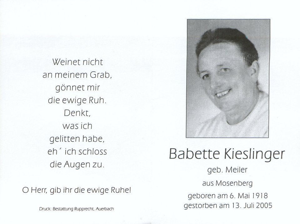 Kausler Anna geb Stauber 29.07.1857-29.09.1934 Kellner Josef 25.11.1889 - 14.08.1965 Kieslinger Babette geb Meiler 06.05.1918-13.07.2005 Kieslinger Karl 28.01.1910 - 06.04.1990 SB