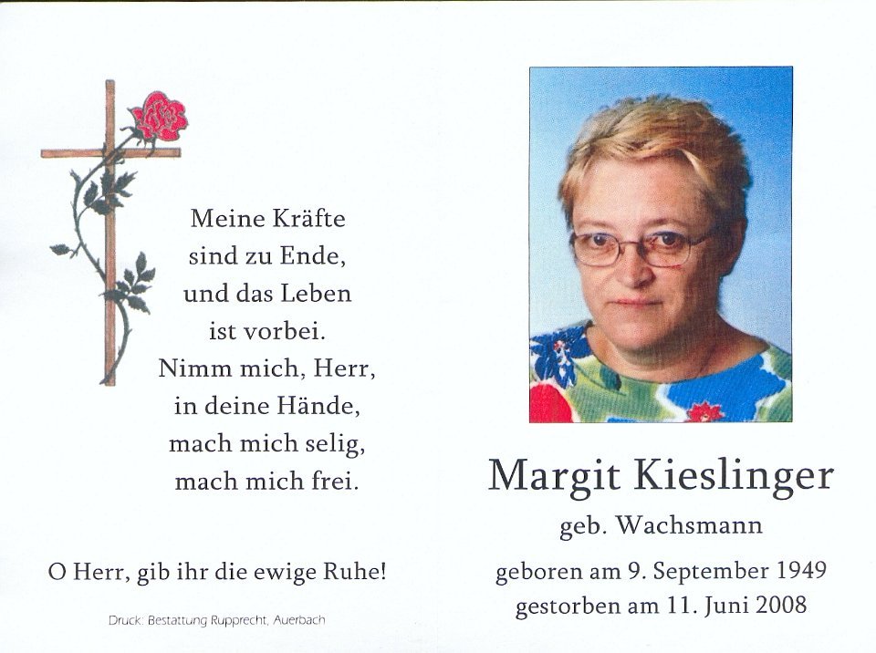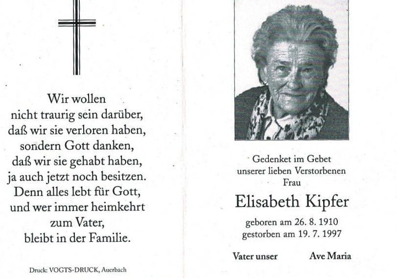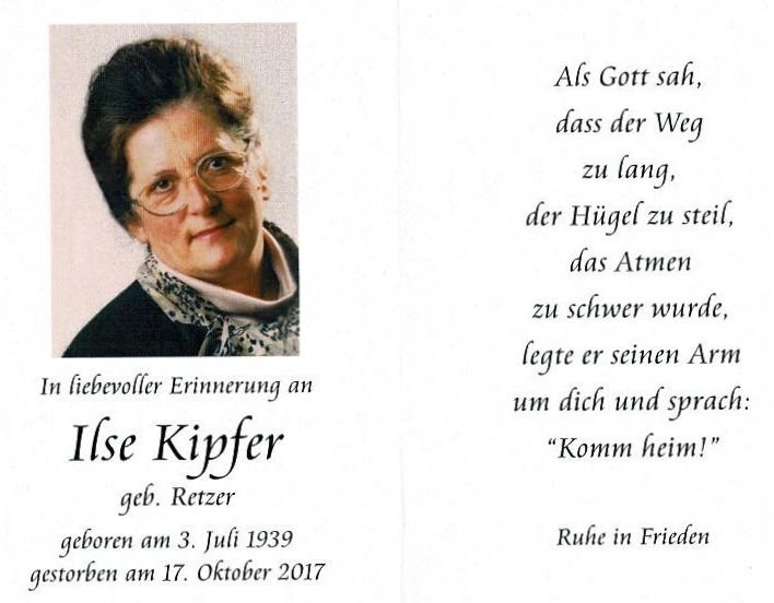 Kieslinger Margit geb Wachsmann 09.09.1949-11.06.2008 Kieslinger Reinhold 19.12.1944 - 14.04.2020 Kipfer Elisabeth 26.08.1910 - 19.07.1997 Kipfer Ilse geb. Retzer 03.07.1939 - 17.10.2017