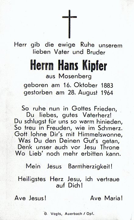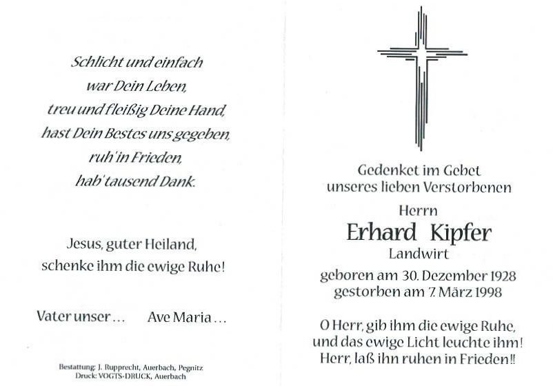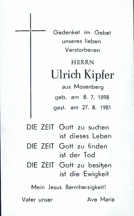 Kipfer Barbara geb Fuchs 16.01.1905-09.11.1985 Kipfer Erhard 30.12.1928 - 07.03.1998 SB Kipfer Hans 16.10.1883-28.08.1964 Kipfer Ulrich 08.07.1898-27.08.1981