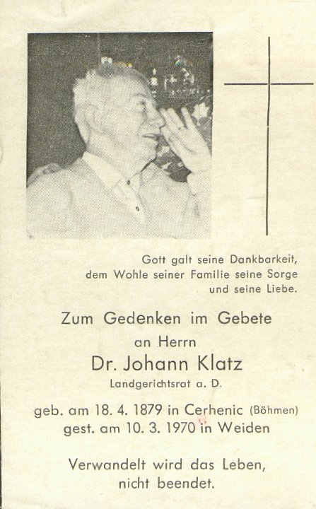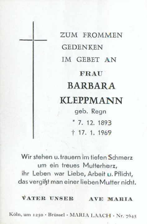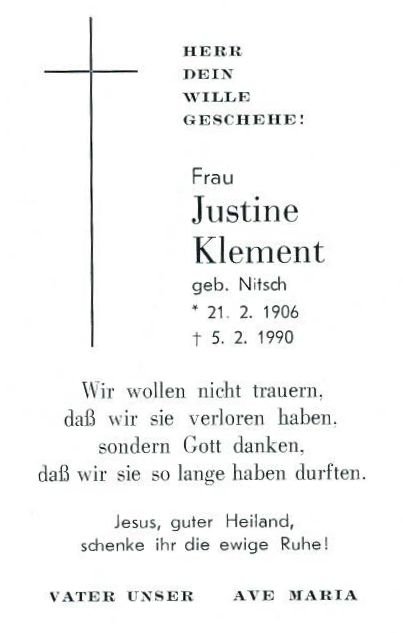 Klatz Johann Dr. 18.04.1879-10.03.1970 Klausnitzer Anni geb. Friedl 14.05.1932 - 09.03.1966 SB Klement Justine geb. Nitsch 21.02.1906 - 05.02.1990 SB Kleppmann Barbara geb Regn 07.12.1893-17.01.1969
