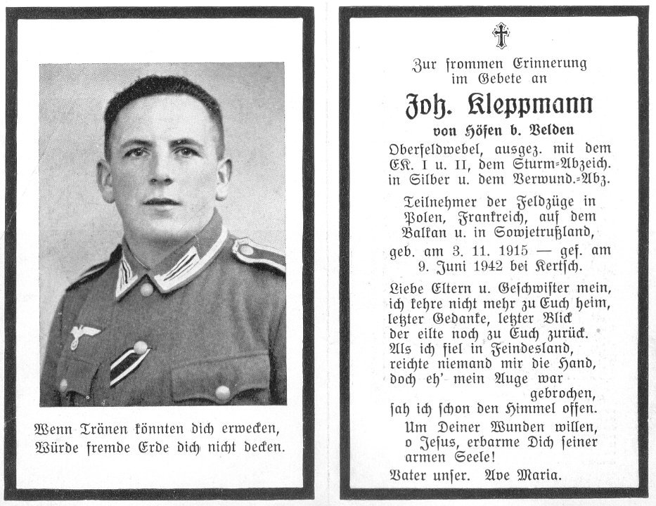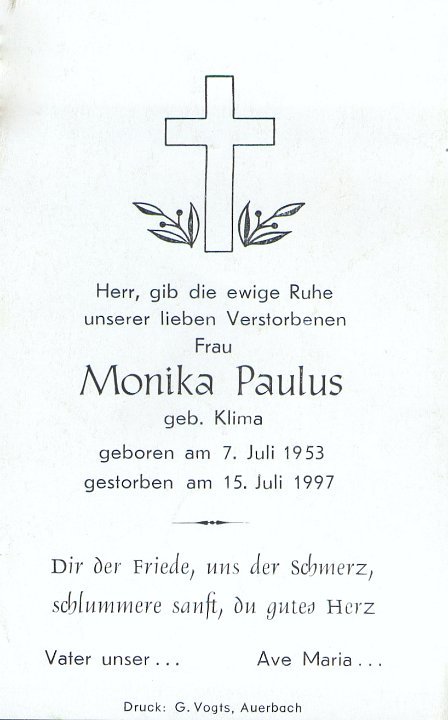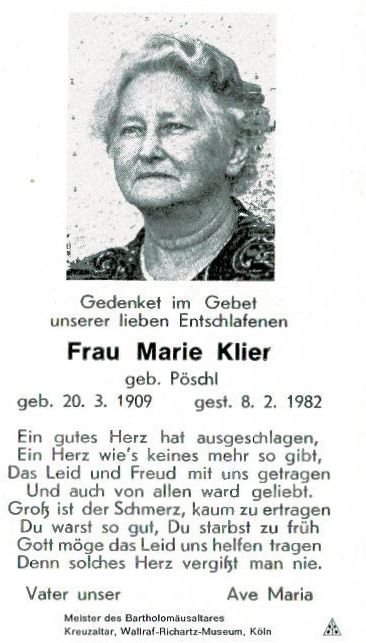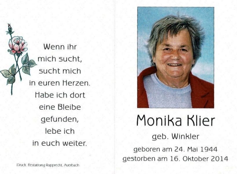 Kleppmann Hans 16.08.1961-11.09.2008 Kleppmann Johann 03.11.1915-09.06.1942 Klier Monika geb. Winkler 24.05.1944 - 16.10.2014 Klier Marie geb. Pöschl - 30.03.1909 - 08.02.1982 SB