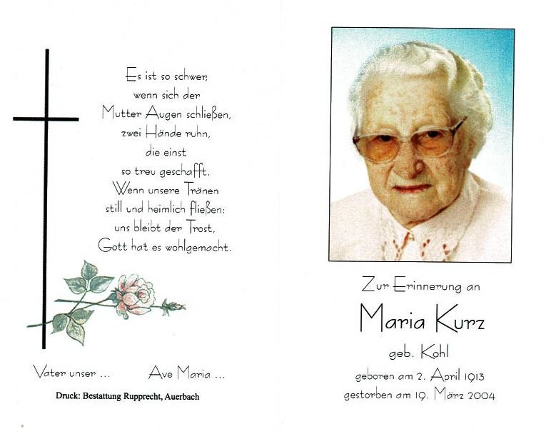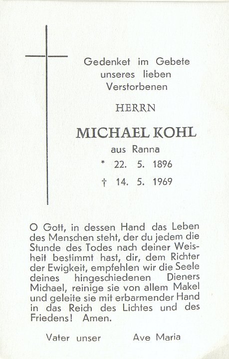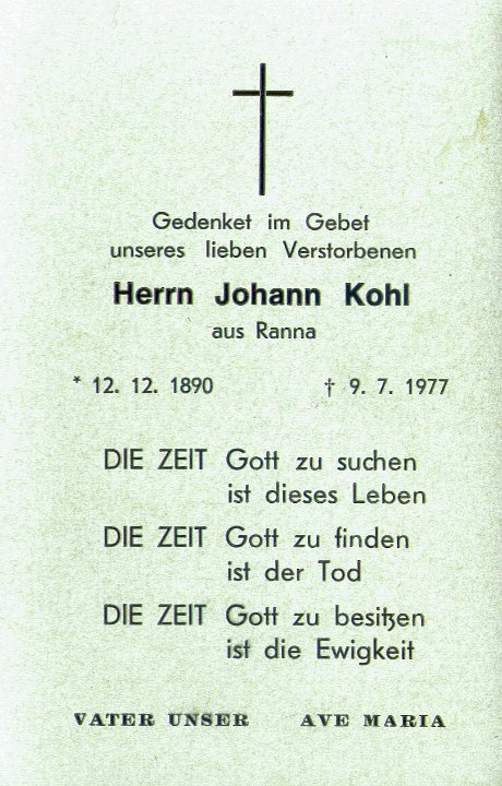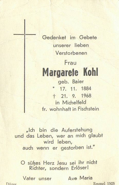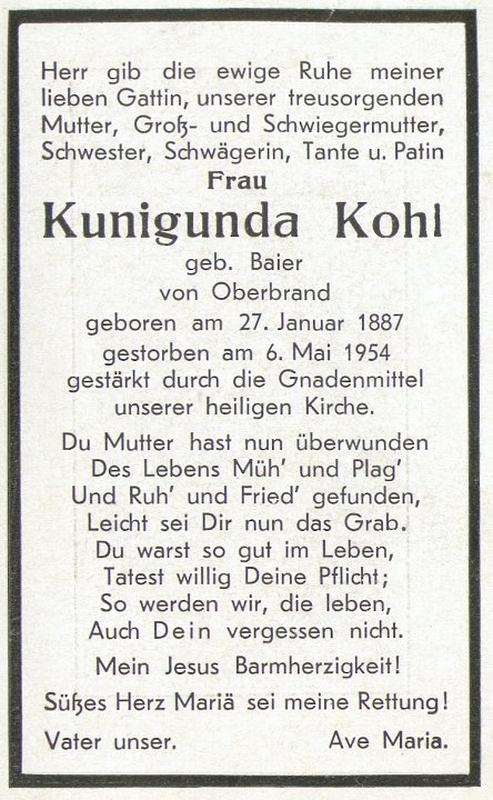 Kohl Johann 12.12.1890-09.07.1977 Kohl Kunigunda Baier 27.01.1887-06.05.1954 Kohl Margarete Baier 17.11.1884-21.09.1968 Kohl Michael 22.05.1896-14.05.1969