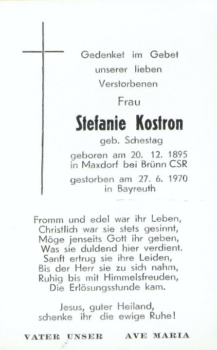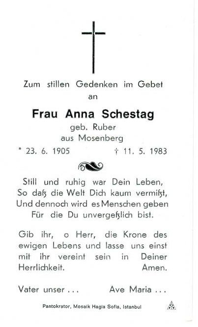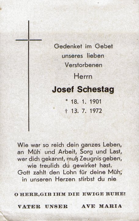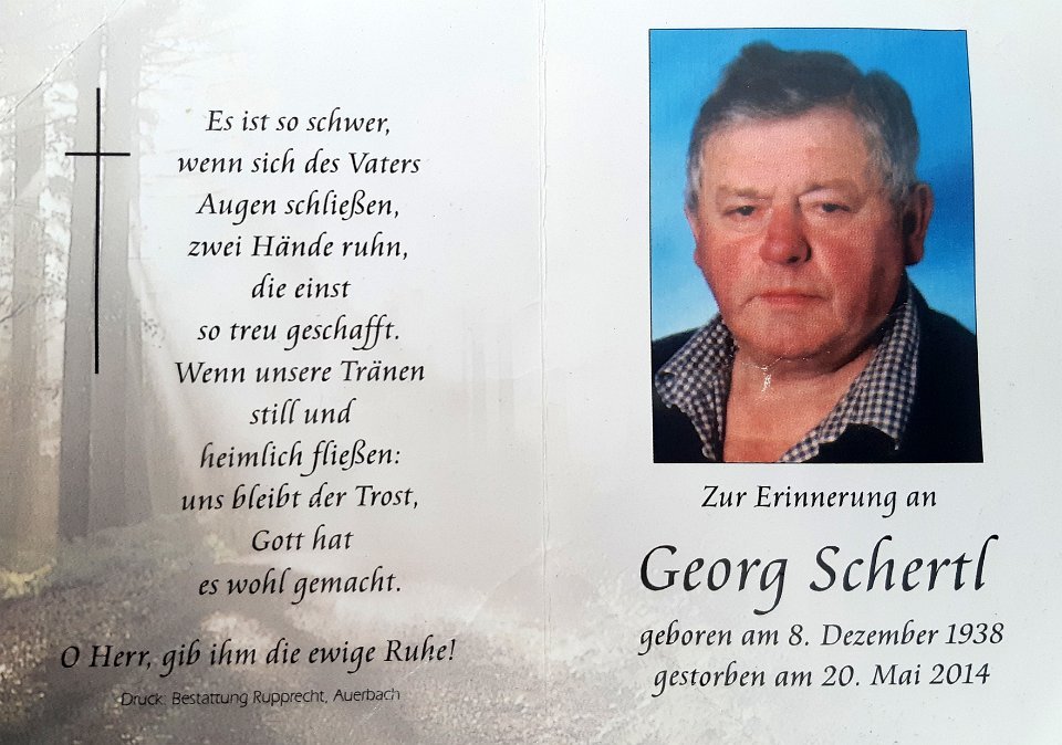 Schertl Georg 08.12.1938-20.05.2014 Schertl Heinrich 12.10.1936 - 14.09.2024 Schestag Anna geb. Ruber 23.06.1905 - 11.05.1983 SB Schestag Josef 18.01.1901-13.07.1972