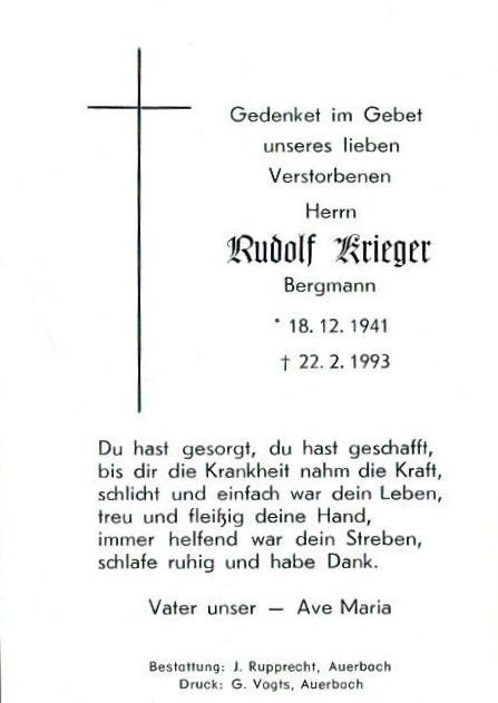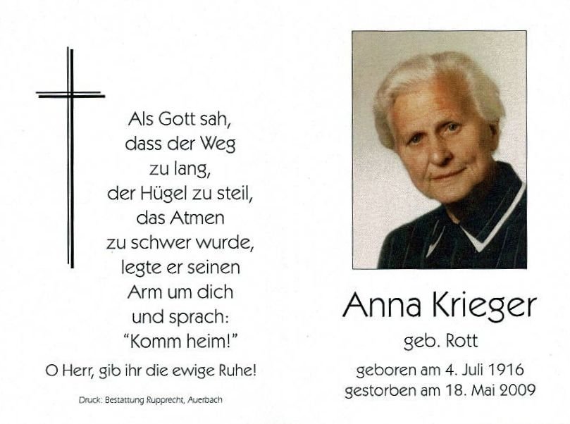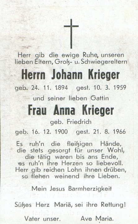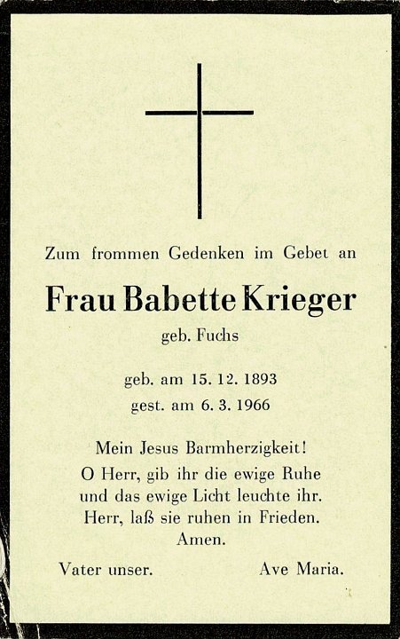 Krieger Babette geb Fuchs 15.12.1893 - 06.03.1966 Krieger Anna geb. Rott - 04.07.1916 - 18.05.2009 SB Krieger Heinz 21.01.1939 - 05.03.2011 SB Krieger Johann 24.11.1894-10-03.1959 und Anna 16.12.1900-21.08.1966