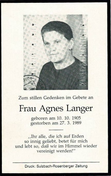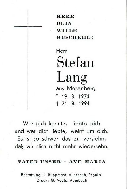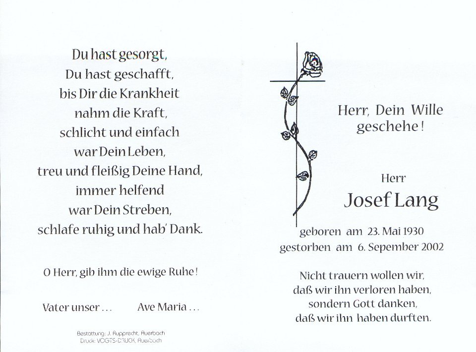 Langer Agnes 10.10.1905 - 27.03.1989 SB Lang Josef 23.05.1930-06.09.2002 Lang Stefan geb. 19.03.1974 - 21.08.1994 SB Laus Georg 30.12.1920 - 31.07.1944 SB