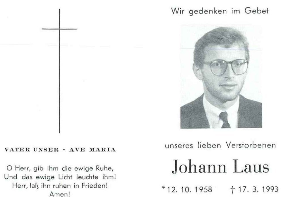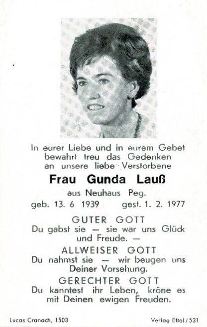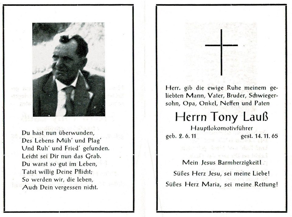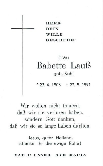 Laus Johann - 12-10-1958 - 17.03.1993 SB Lauss Tony 02.06.1911 - 14.11.1965 Lauß Babette geb. Kohl 23.04.1903 - 22.09.1991 SB Lauß Gunda 13.06.1939 - 01.02.1977 SB